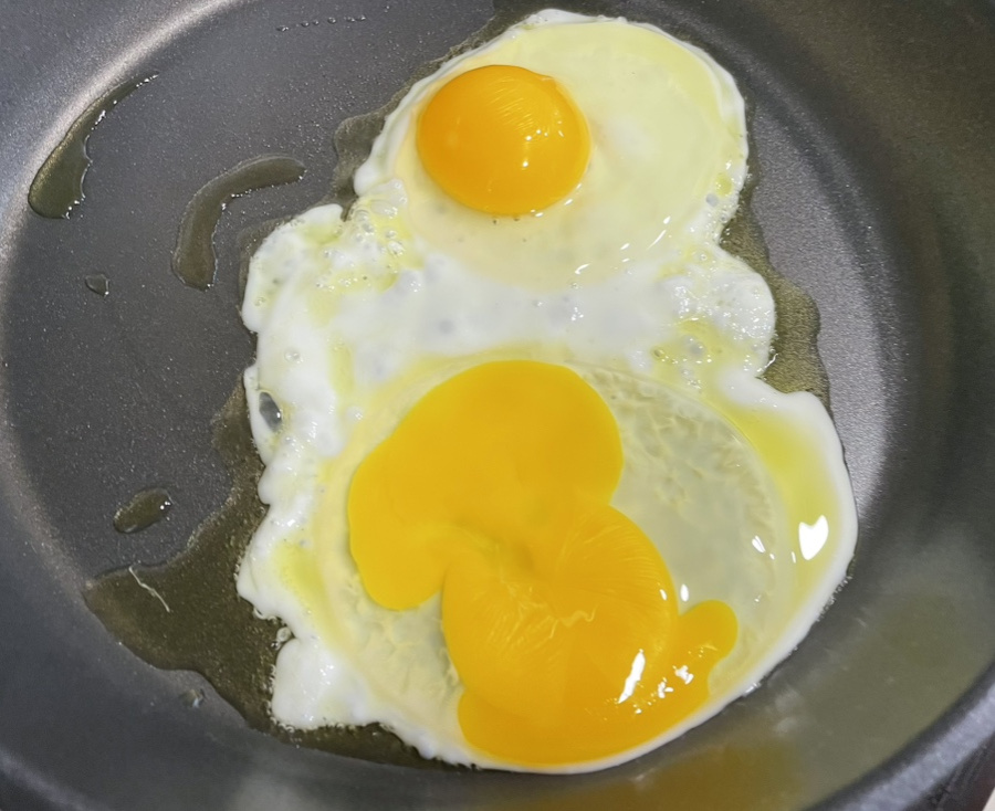 중강불로 예열한 후라이팬에 올리브오일 2스푼 정도 코팅하고 계란을 넣어요.