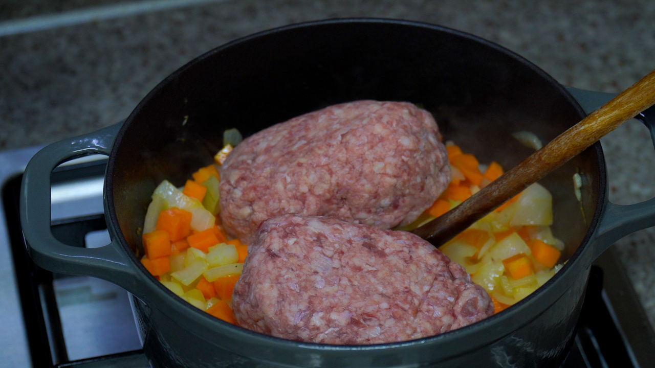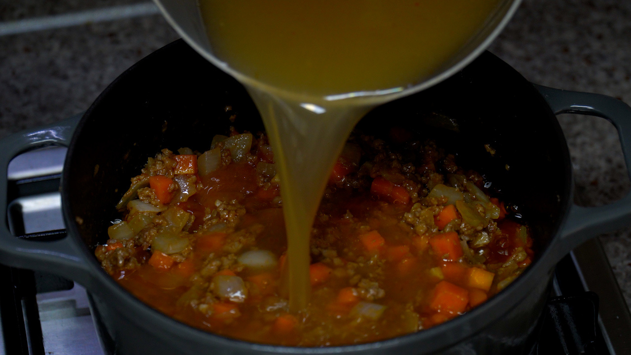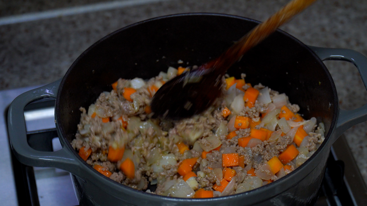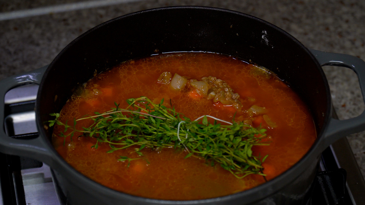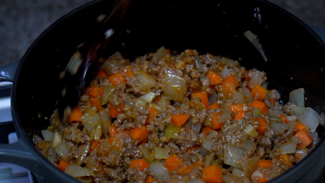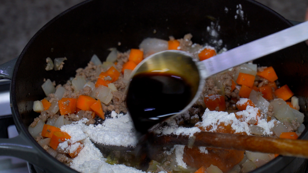 다진 소고기 400 g , 양파 1 개 , 마늘 2 쪽 , 당근 1/2 개 , 타임 5 g , 밀가루 2 T , 토마토 페이스트 1 T , 비프 스톡 육수 500 ml , 우스터 소스 2 T , 올리브유 , 소금 , 후추