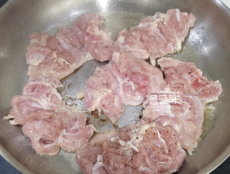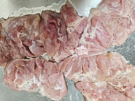 손질한 닭다리살에는 맛술 1큰술, 소금, 후추 약간을 넣고 10분 정도 밑간해두세요.