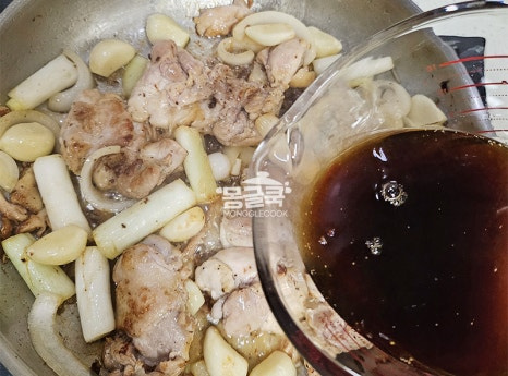 여기에 미리 섞어둔 데리야끼소스를 부어 끓이기 시작해요.