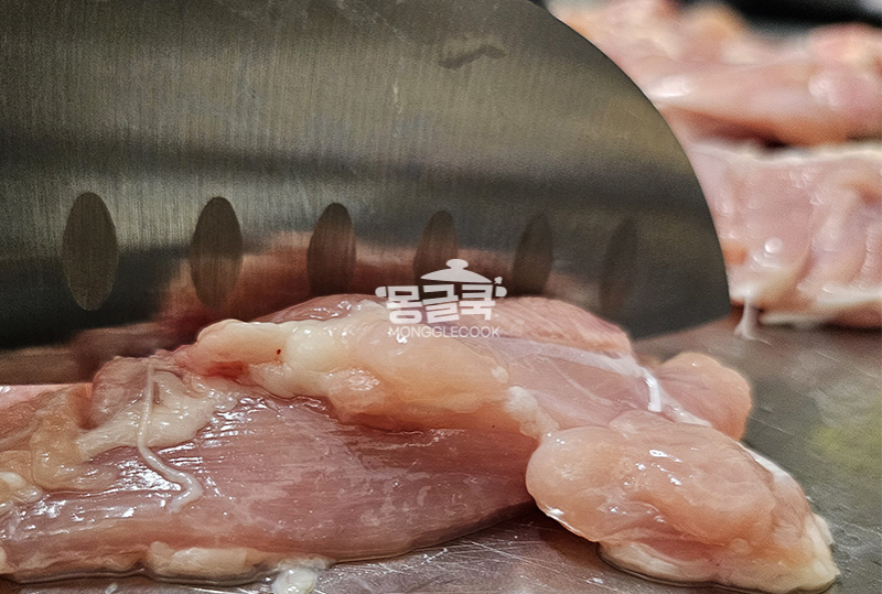 기름기나 힘줄이 많은 부분은 칼로 정리해 주고, 두꺼운 부분에는 칼집을 2~3줄 넣어주세요.