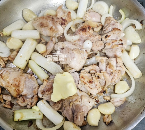 닭고기 속까지 익으면 버터 10g을 넣고 녹여 풍미를 주세요.