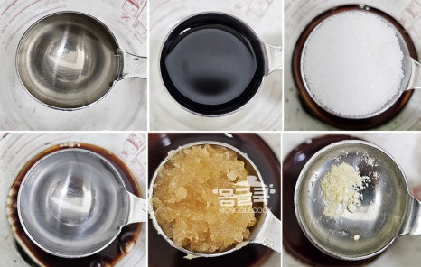 작은 볼에 간장 4큰술, 맛술 4큰술, 물 4큰술, 설탕 2~3큰술, 다진 마늘 1작은술, 생강가루 약간(선택)를 넣고