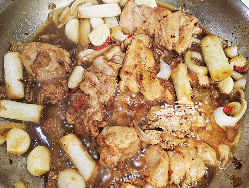 닭고기를 굽는 동안 통마늘, 양파, 대파도 함께 넣어주세요.