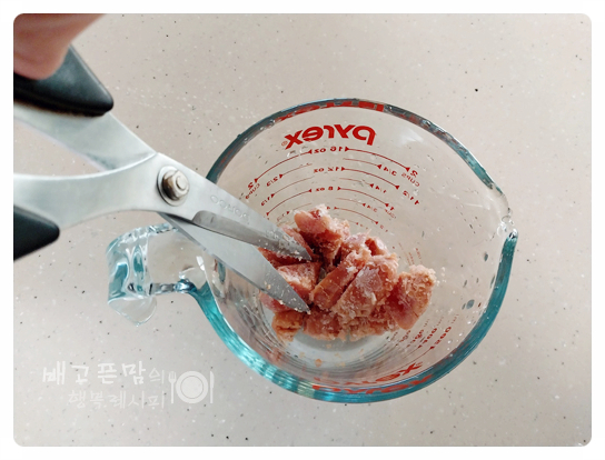 냉동실에 얼려둔 명란을 가위로 잘게 자르고