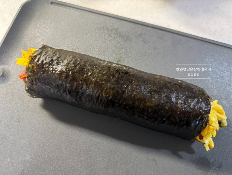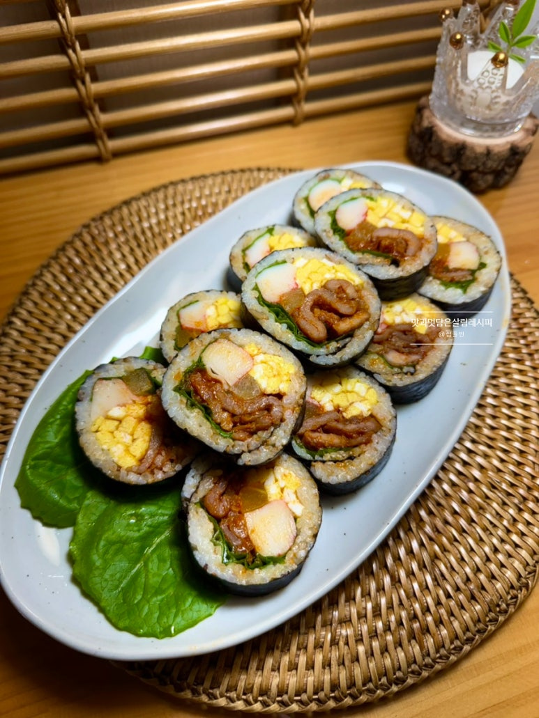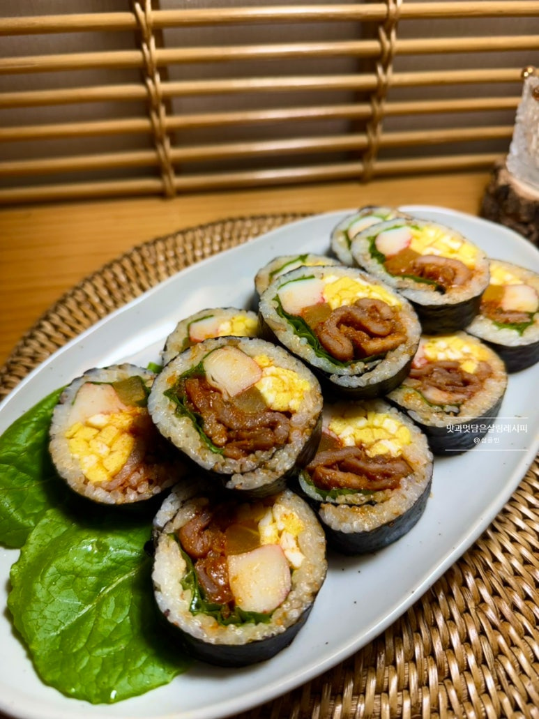 메인 재료인 고기 듬뿍 넣어 만들기 때문에 추가 재료는 좋아하는 몇 가지로 간단히 넣어도 맛 충분히 낼 수 있고요. 일반 김밥보다 훨씬 풍미 가득 살려 먹을 수 있어서 나들이뿐 아니라 평소 집밥 메뉴로도 좋습니다.