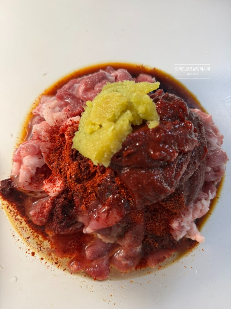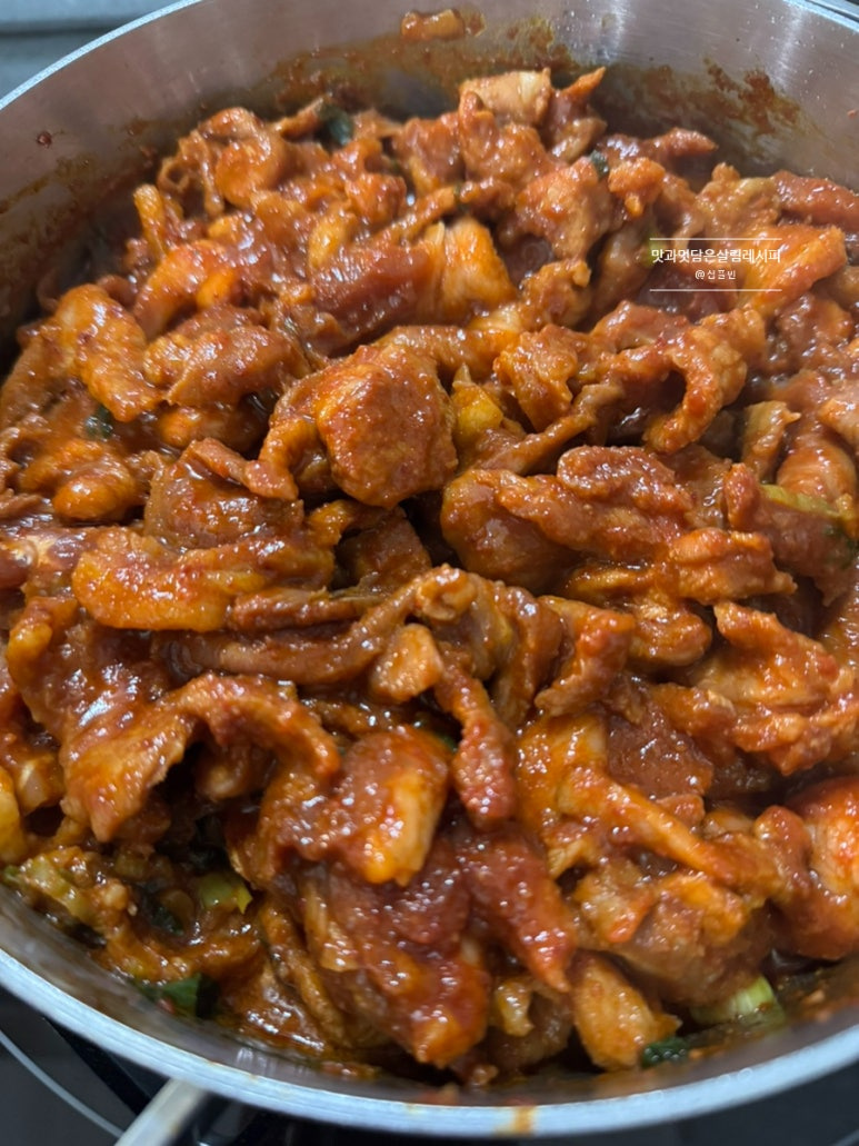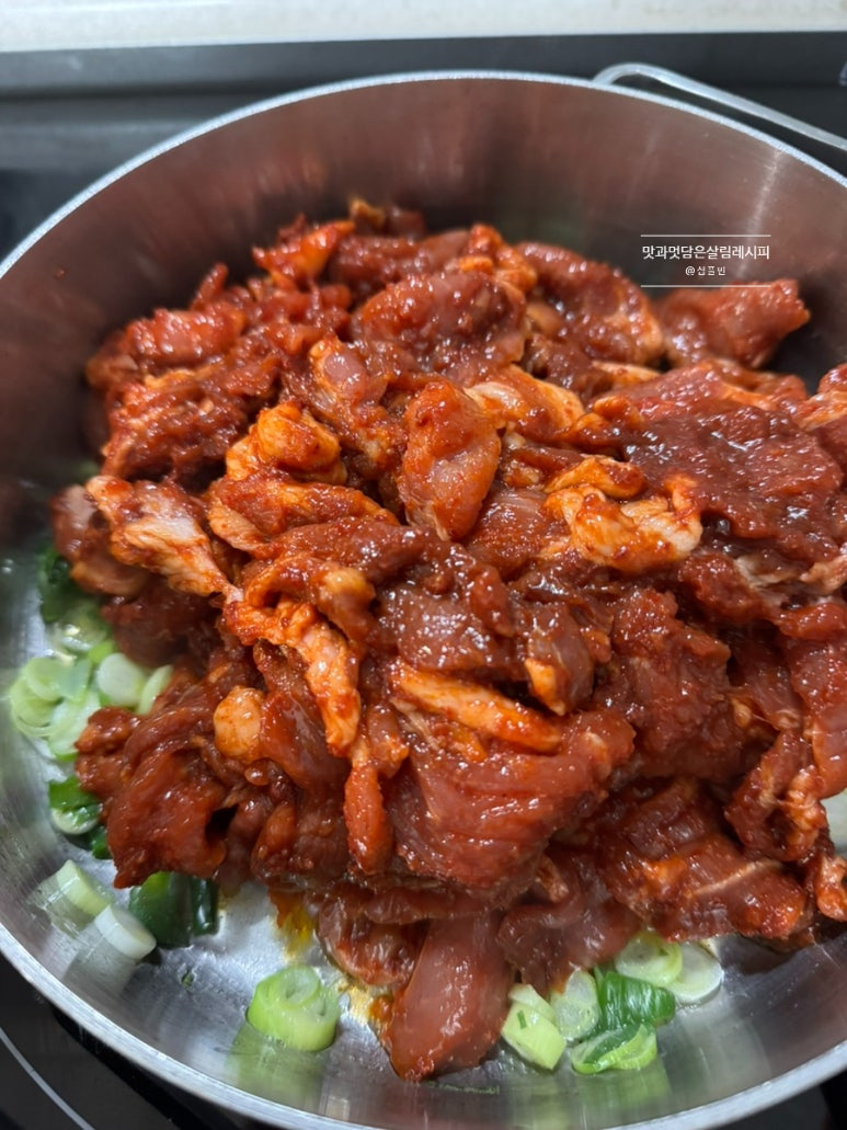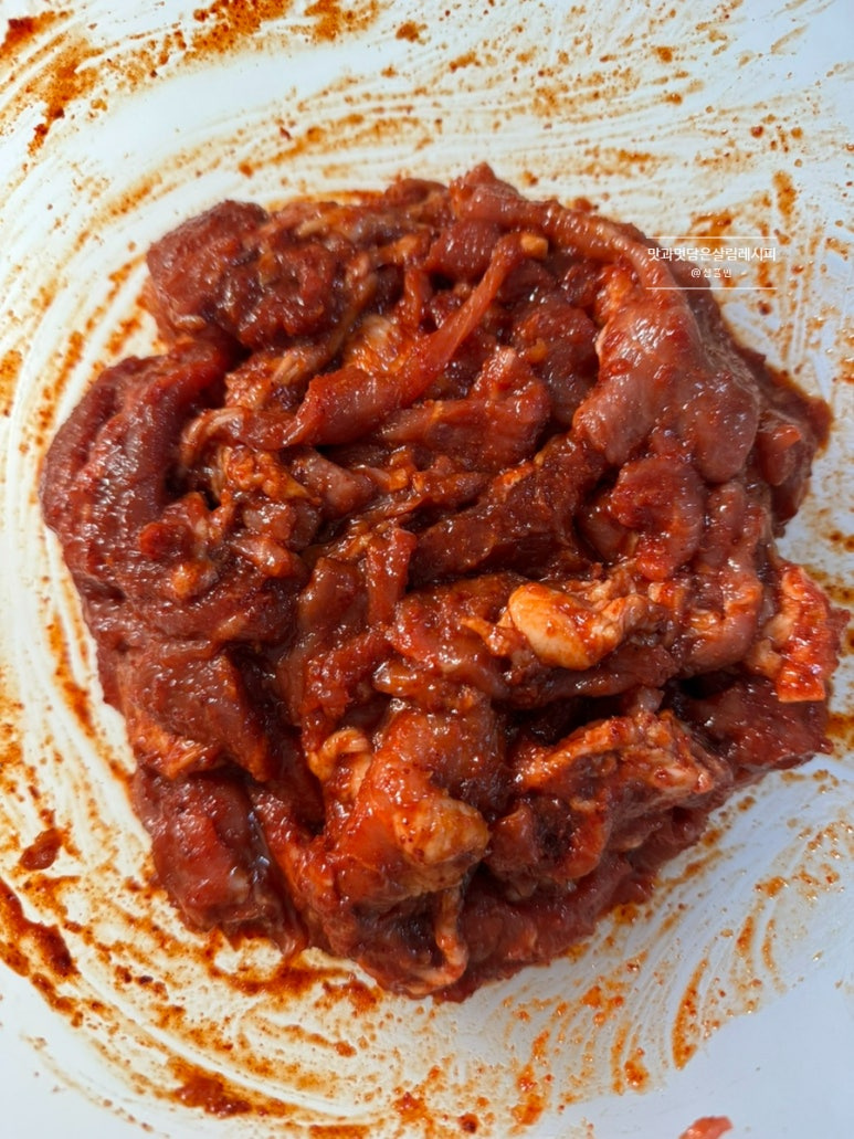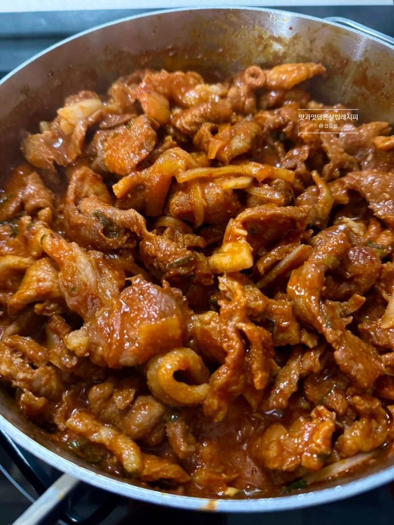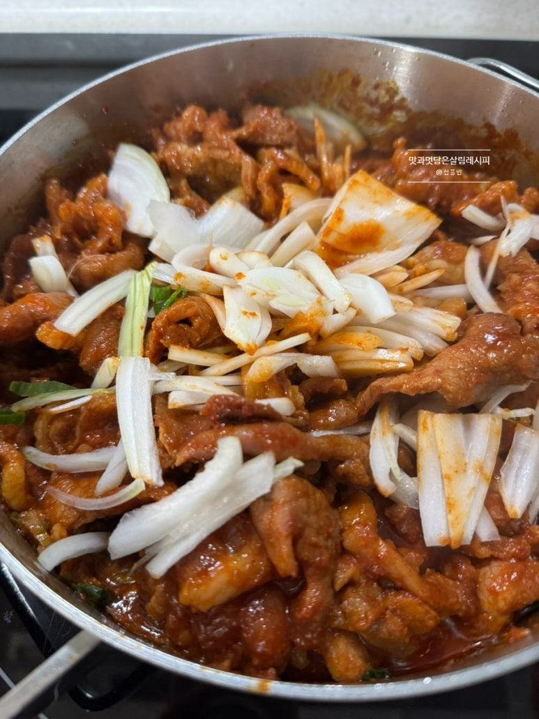 평소 메인 반찬으로 만드는 제육볶음 레시피와 같은 양념이지만 밥 안에 풍성하게 넣기 때문에 센 불과 좀 적은 야채를 넣고 수분 없이 진하게 볶아내는 것이 포인트입니다.