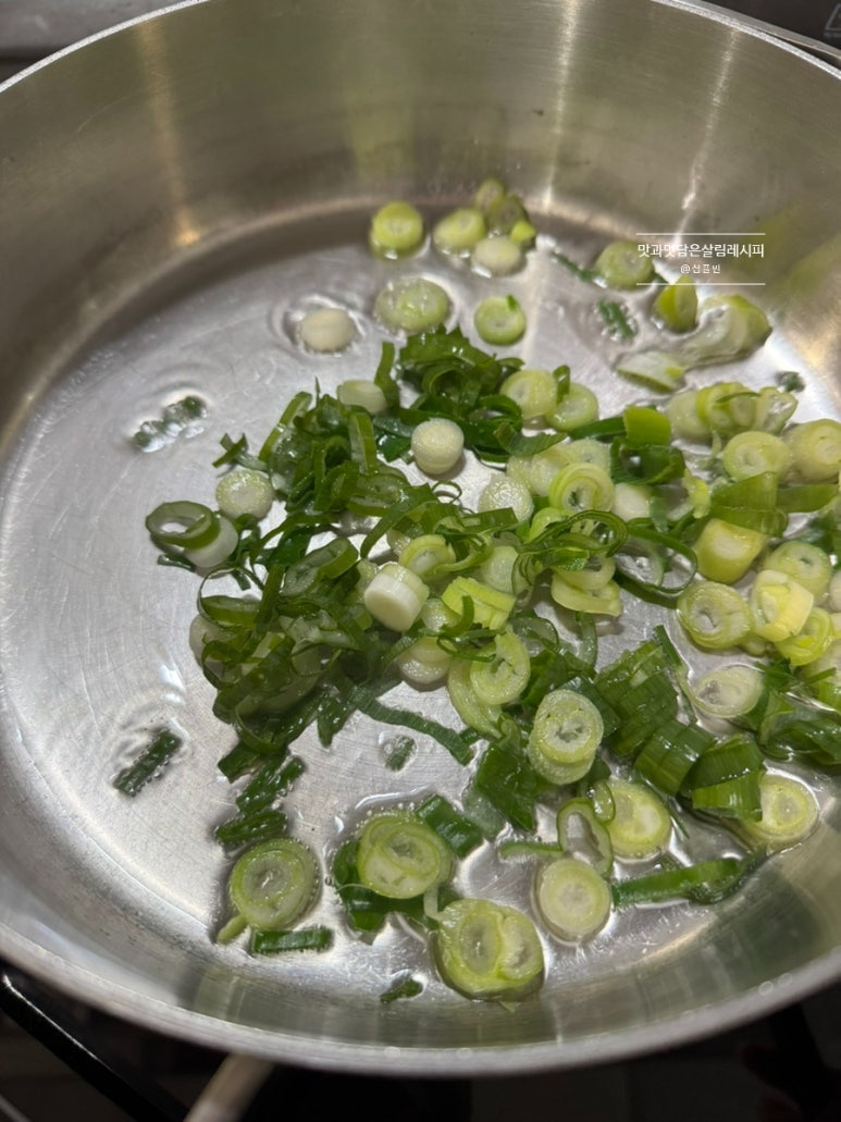 달군 팬에 식용유 3큰술 정도 두르고 썬 대파 넣고 노릇하게 볶아 파기름 내줍니다. 타지 않도록 중불에서 볶아주세요.