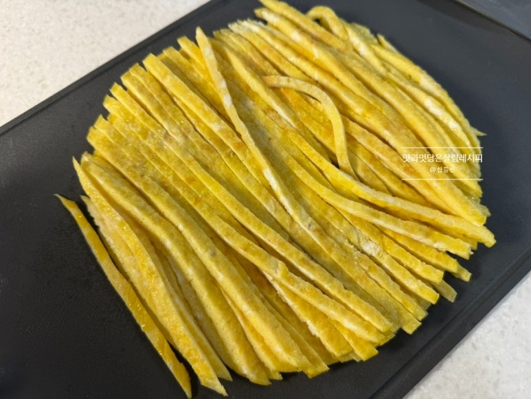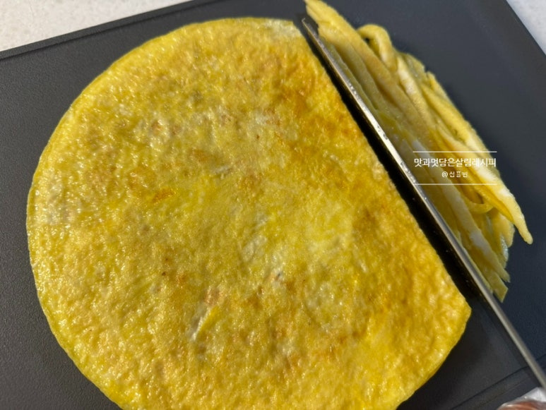 위와 같이 채 썰 듯 얇게 썰어도 좋고요. 두껍게 썰어도 좋아요. 저는 얇게 썰어 여러 줄 넣어주고 있어요.