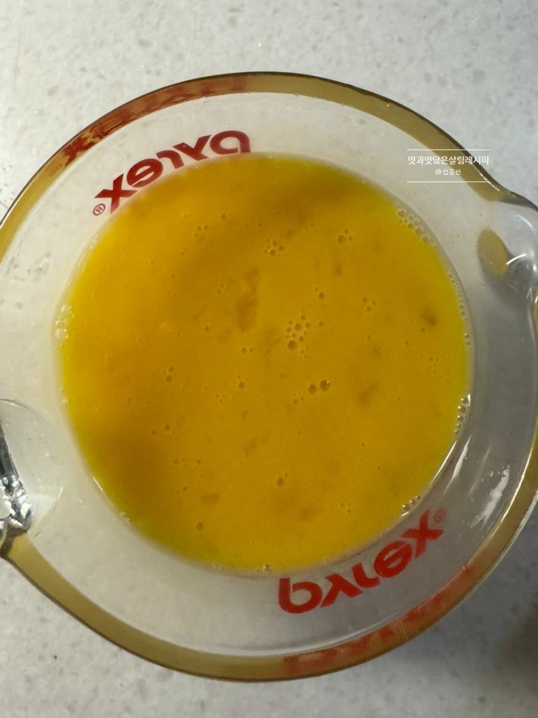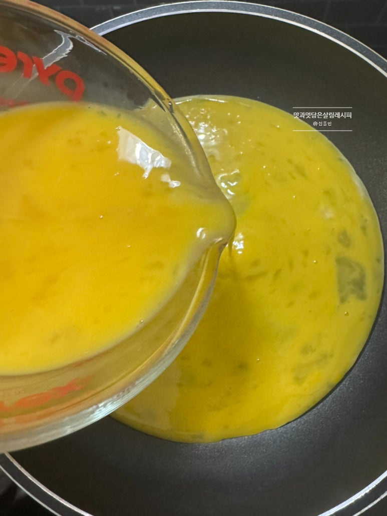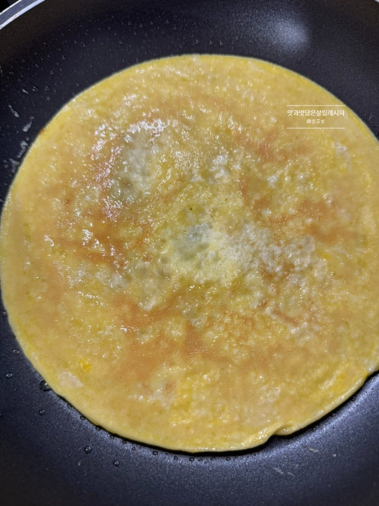 두 번에 나누어 구워주는데요. 달군 팬에 식용유 약간 두르고 푼 달걀물 절반으로 나누어 2번에 걸쳐 구워줍니다. 앞뒤 노릇하게 굽습니다.