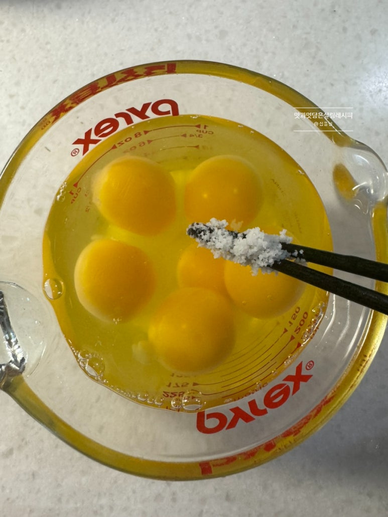 달걀 5~6개 깨뜨려 넣고요. 소금도 두 꼬집 정도 넣어줍니다. 달걀지단 푸짐하게 넣는 기준의 양입니다.