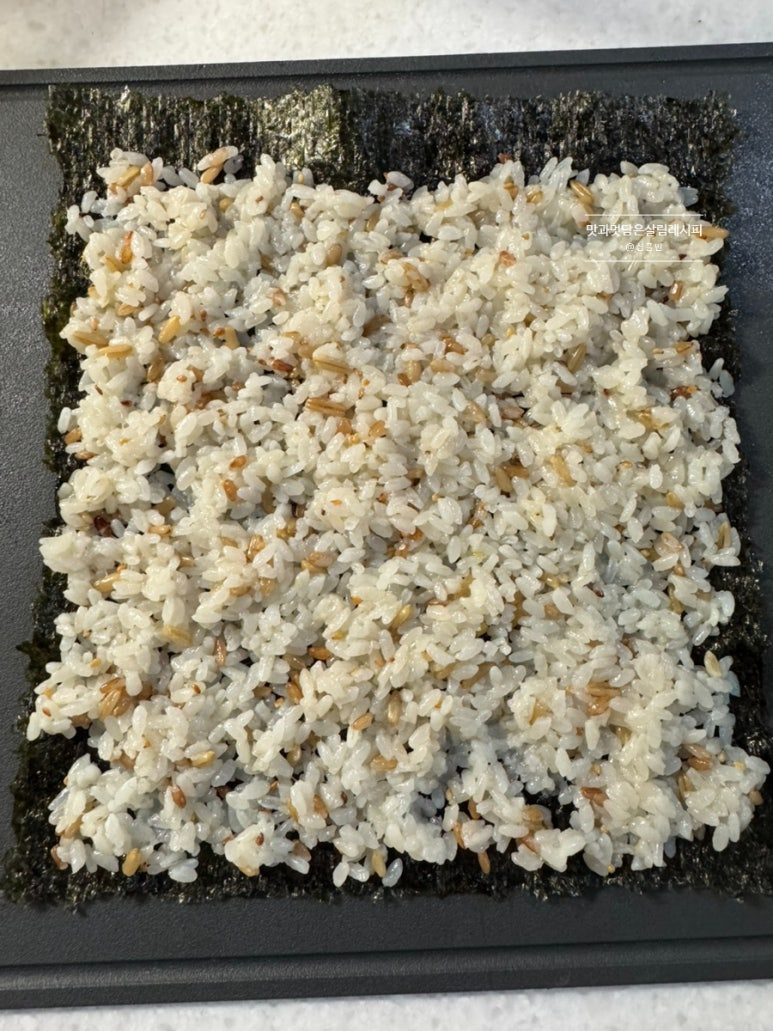 김밥김 위에 밥부터 고루 얇게 펼쳐 깔아줍니다. 끝 3cm 정도는 남겨줍니다.