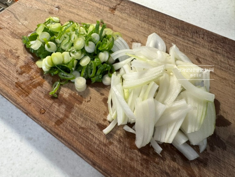 대파 넉넉하게 한대 썰어주고 양파는 너무 많으면 물기가 생기기 때문에 이번에는 1/3개 얇게 썰어줍니다. 보다 매콤하게 볶기 위해서 청양고추를 추가해 주어도 좋아요.