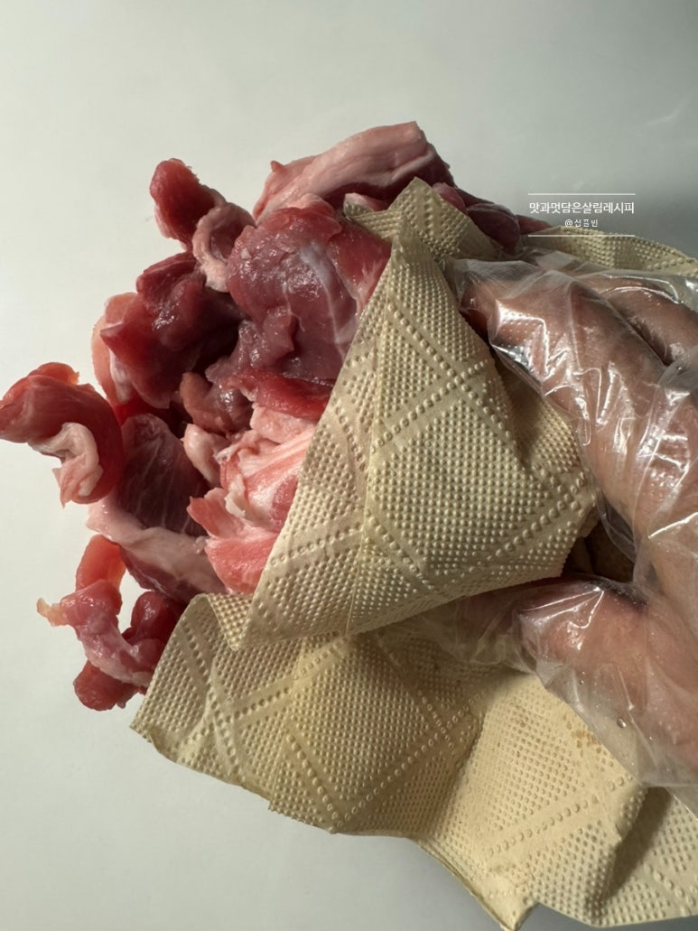 앞다리살 600g이고요. 너무 커서 듬성듬성 가위로 썰어주었습니다. 키친타월을 활용해 핏기를 꾹꾹 눌러 제거해 줍니다.