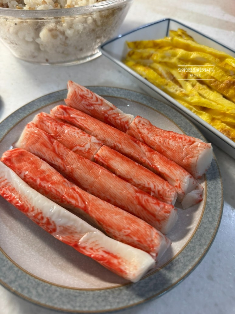추가 재료로 크래미 맛살과 단무지도 준비했어요. 취향껏 추가 재료 선택해 줍니다. 메인 재료를 푸짐하게 넣기 때문에 추가 여러 가지 넣지 않아도 충분히 맛있어요.