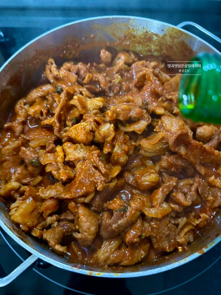 불을 끄고 참기름 한두 바퀴 둘러 고소함 가득 살려 마무리합니다. 이렇게 메인 속 재료인 제육 완성입니다.