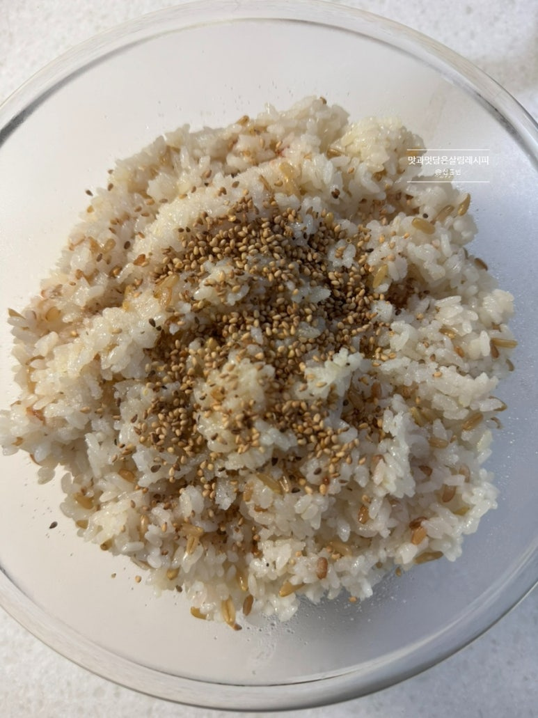 밥 기본 밑간해주도록 할게요. 3공기 가량에 고소한 참기름 2큰술과 깨 1큰술 넣고요. 소금은 저는 일반 소금 반 작은술 넣어주었는데 맛소금을 활용하면 감칠맛 더할 수 있습니다.