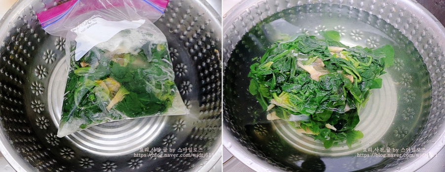 겨울 시금치 데쳐서 냉동시켰었는데 시금치 쌕이 바로 데친 시금치와 다르지 않아요