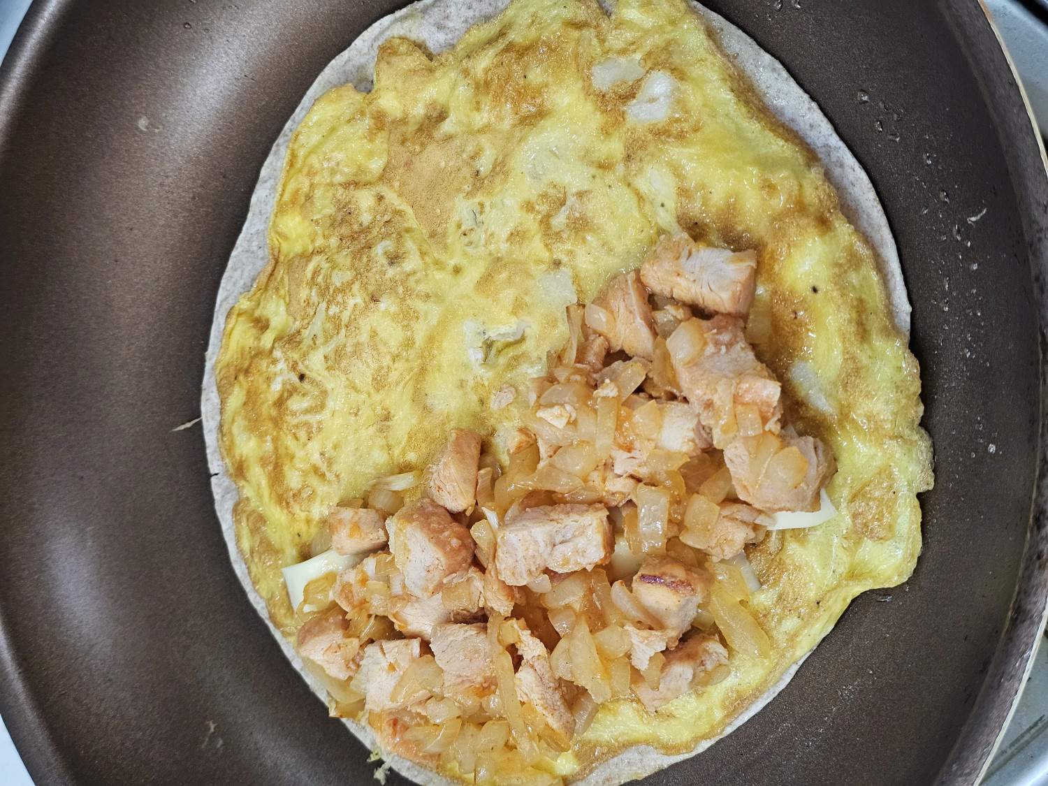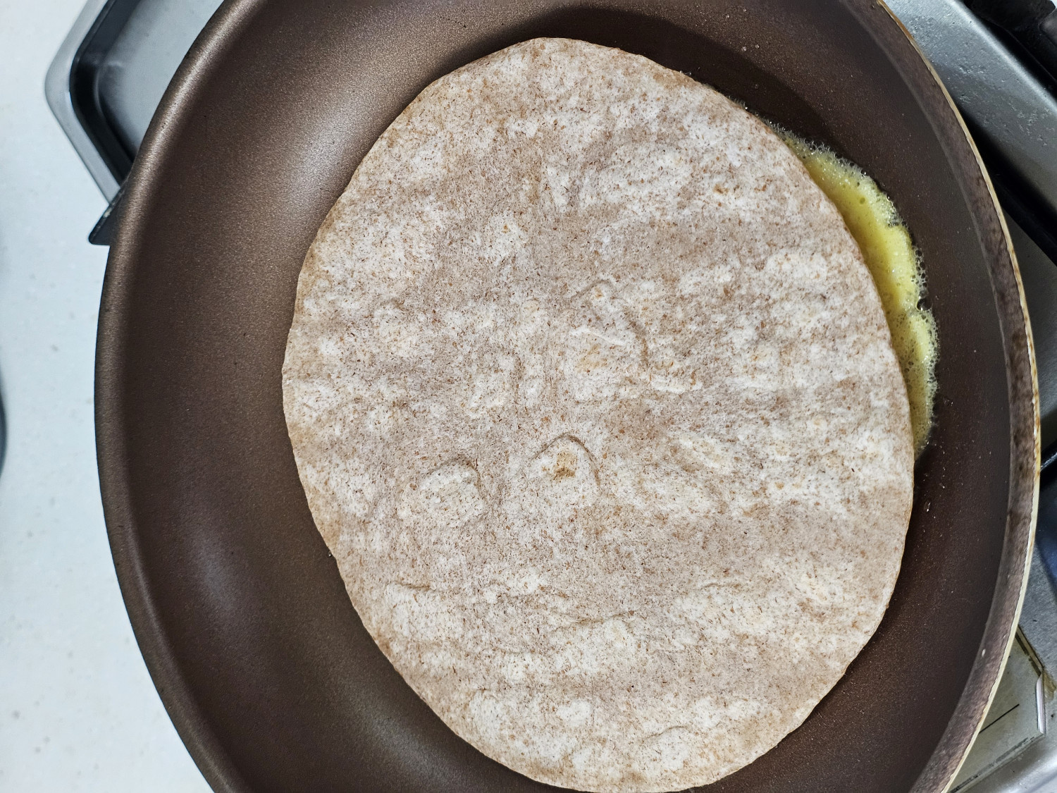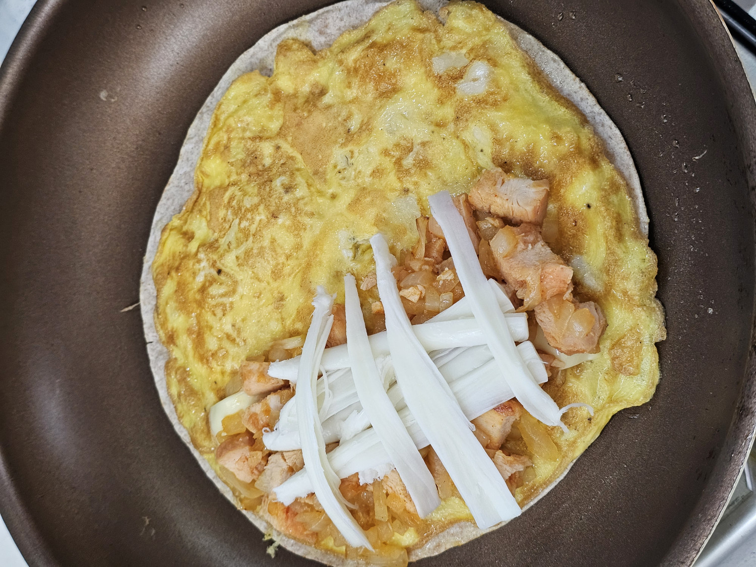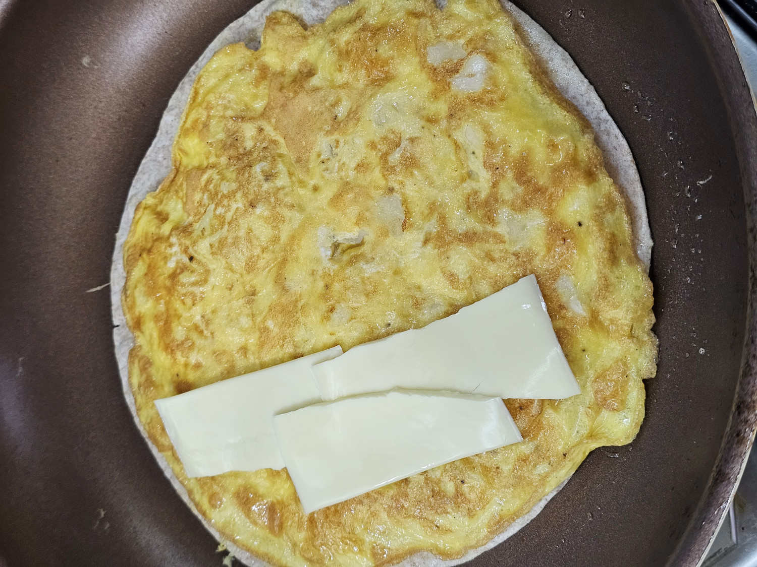 계란이 반쯤 익었을 때 또띠아를 올리는 게 포인트!