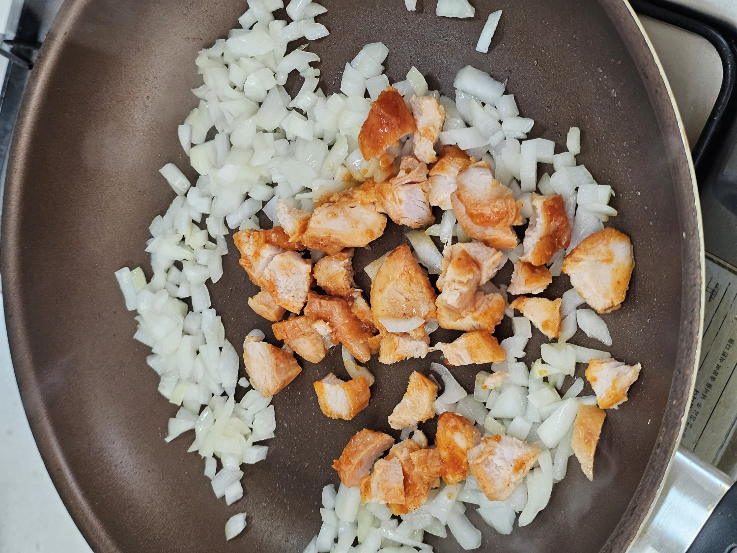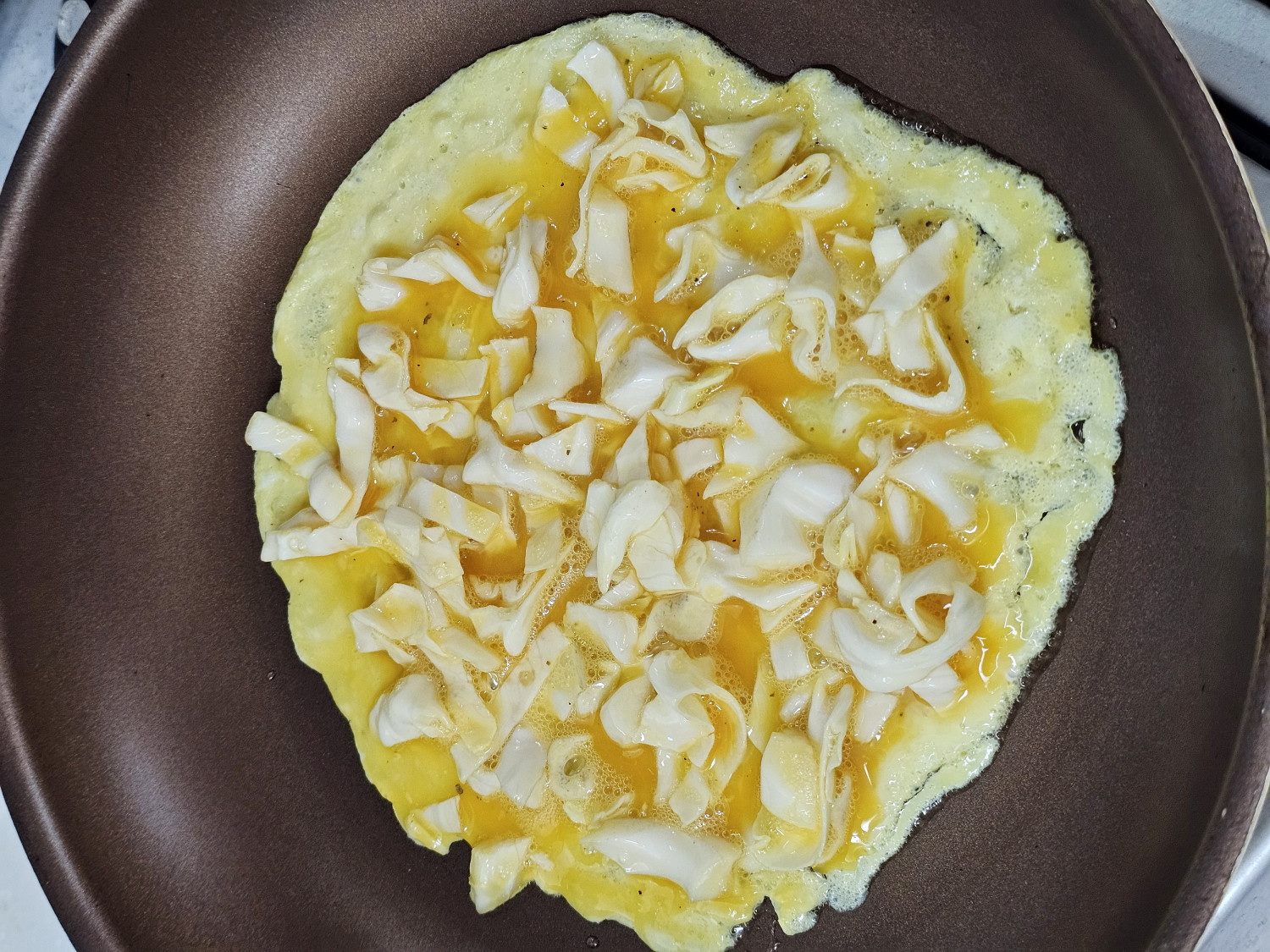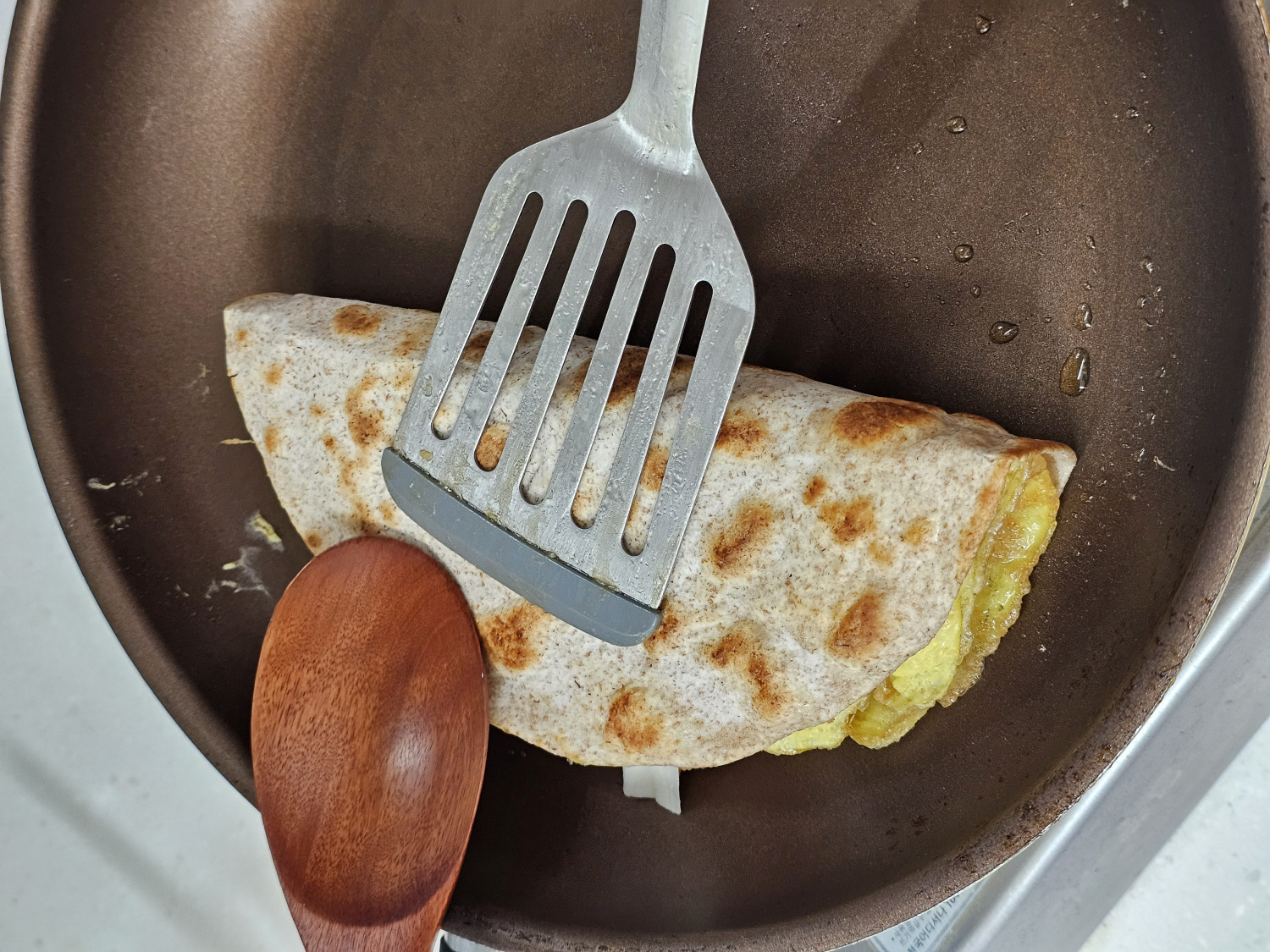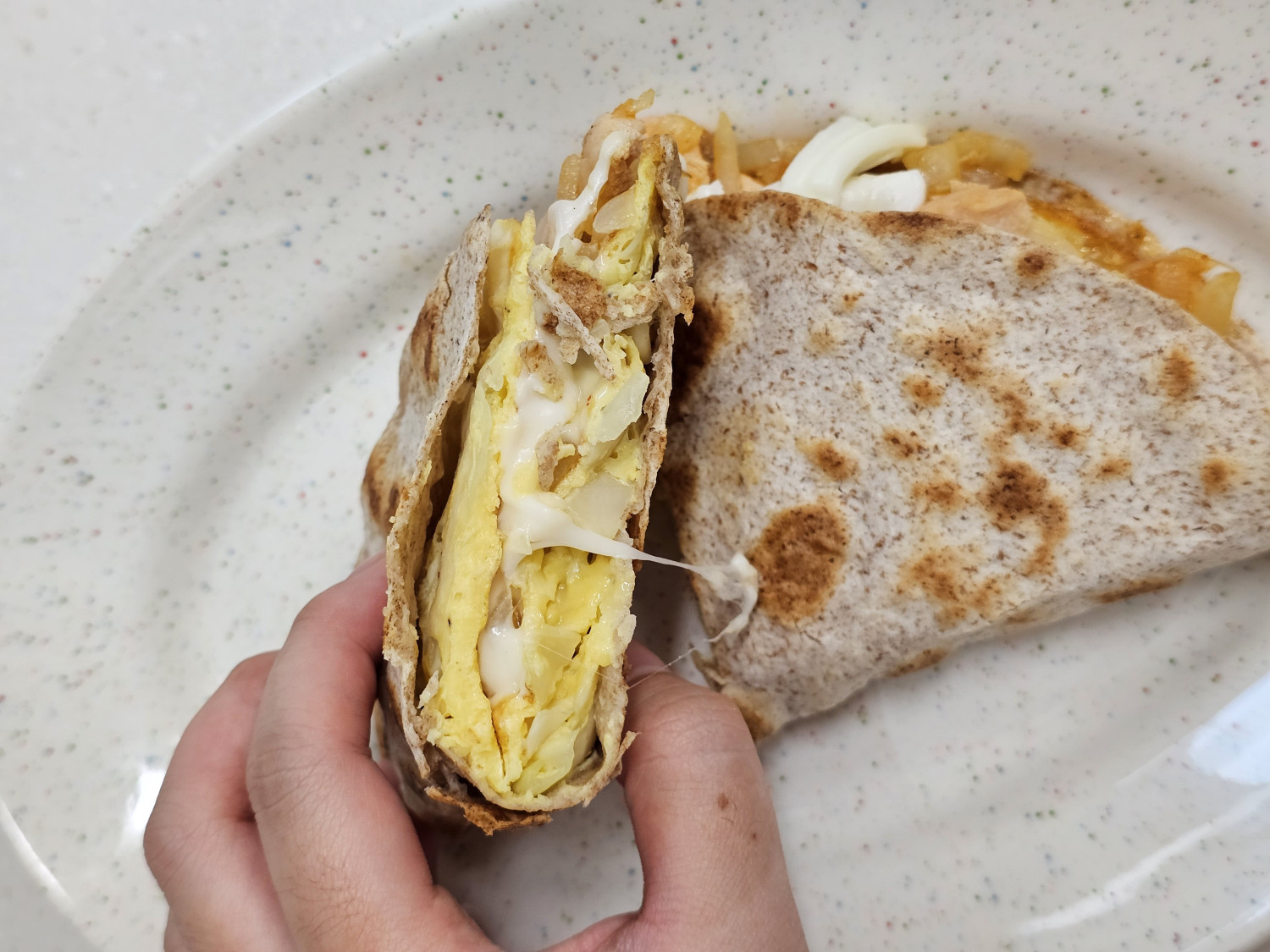 계란이 반쯤 익었을 때 또띠아를 올리는 게 포인트!