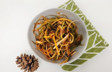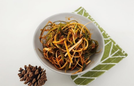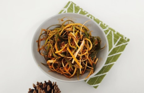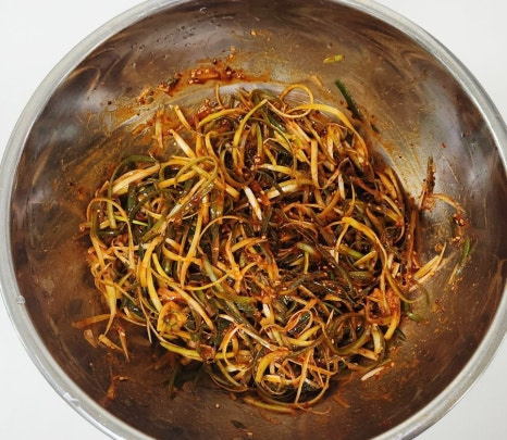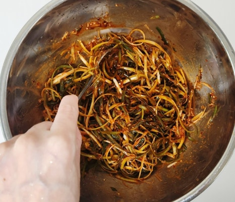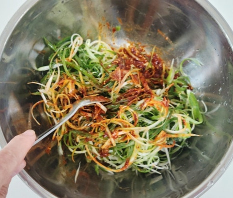 물기를 충분히 뺀 파채를 양념장에 넣고 살살 버무려주세요. 이때 힘을 주어 마구 비비면 파채가 금세 짓무르고 숨이 죽어버리니, 가볍게 살살 무쳐주어야 합니다.