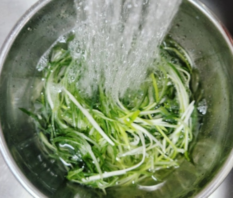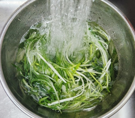 파채 190g을 깨끗하게 준비해 주세요. 파채를 준비했다면 넉넉한 볼에 물을 받아 3~4번 정도 헹궈주세요. 파의 흙이나 이물질을 완전히 제거하는 것이 중요합니다. 이후 채반에 받쳐 10분 정도 물기를 빼줍니다. 물기를 완전히 제거하지 않으면 양념이 잘 배지 않고 금세 흐물흐물해질 수 있어요.