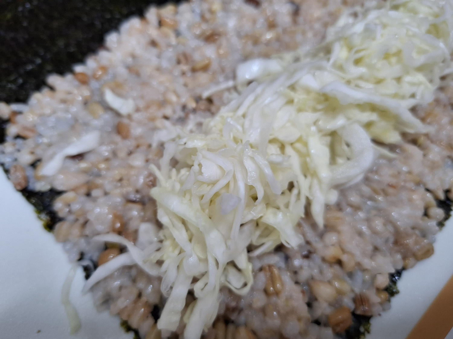 잘 펴준 밥 위에 절여둔 양배추채와