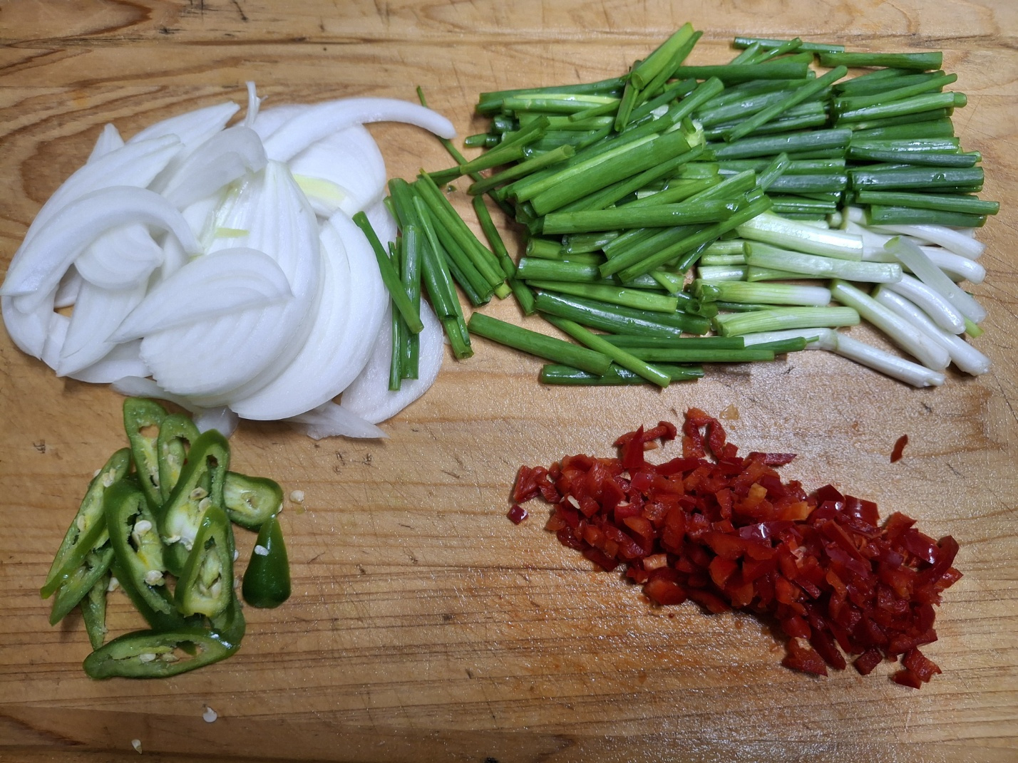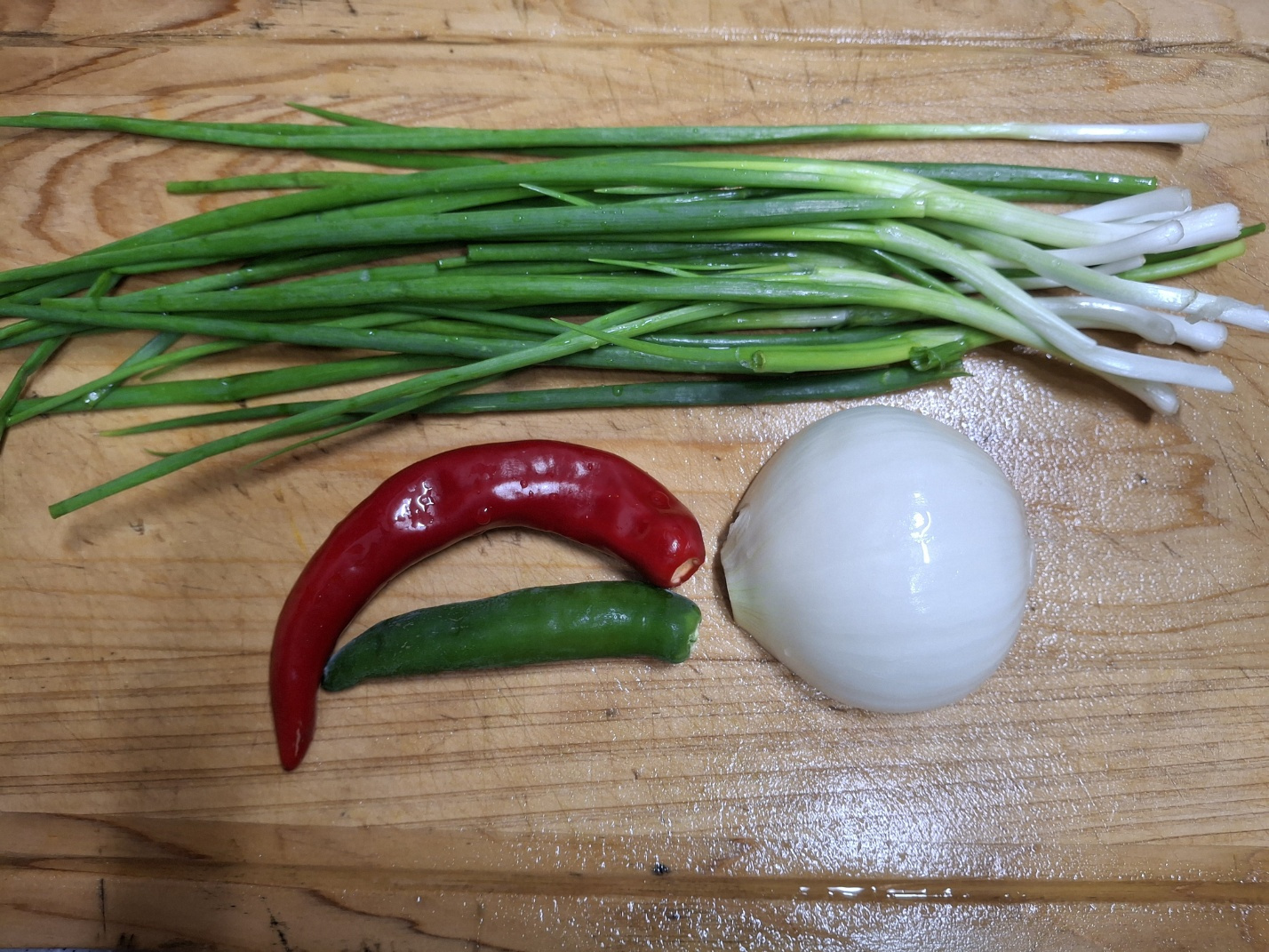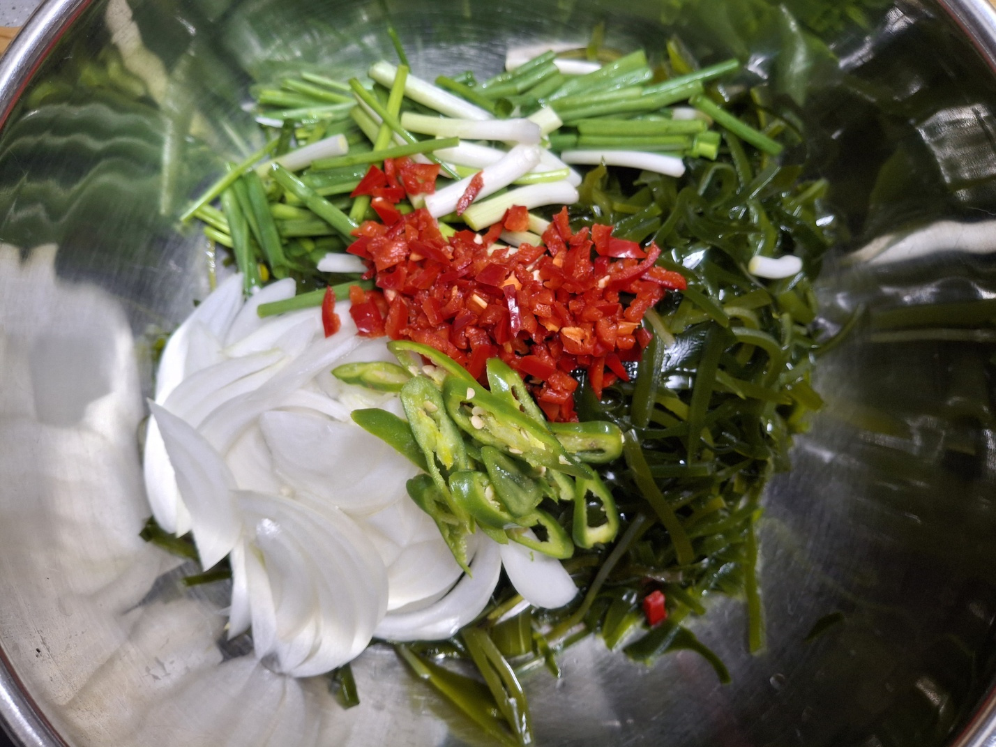 양파 1/2개, 쪽파 반 줌, 청양고추 1개, 홍고추 1개