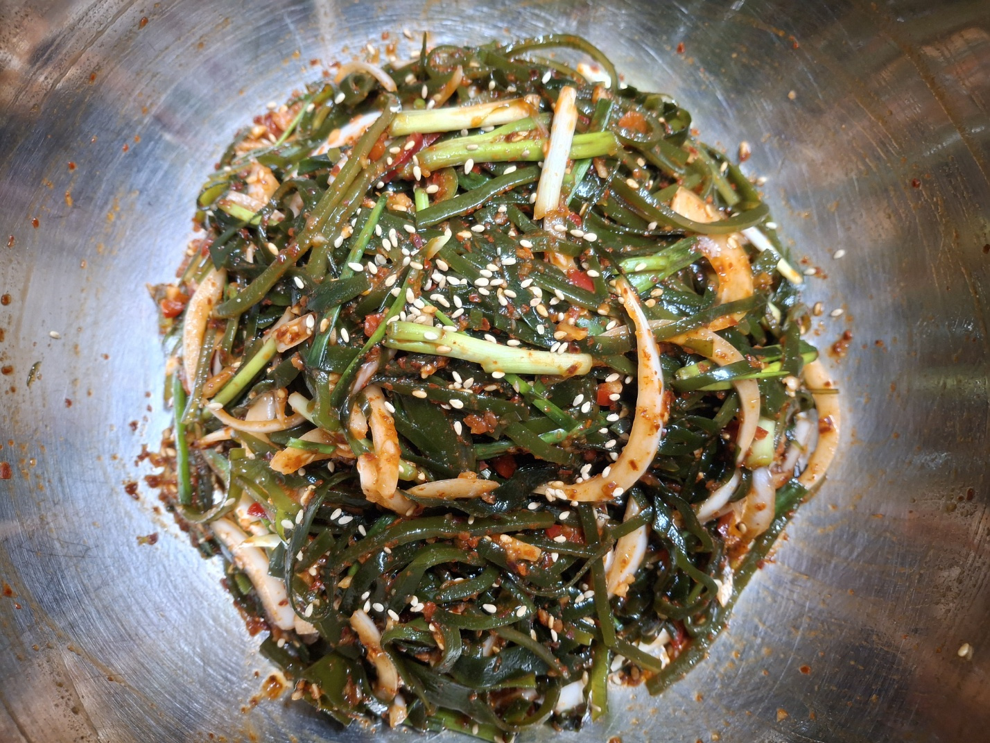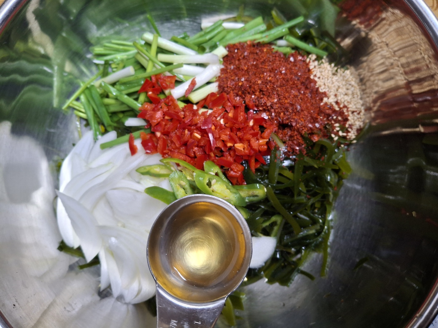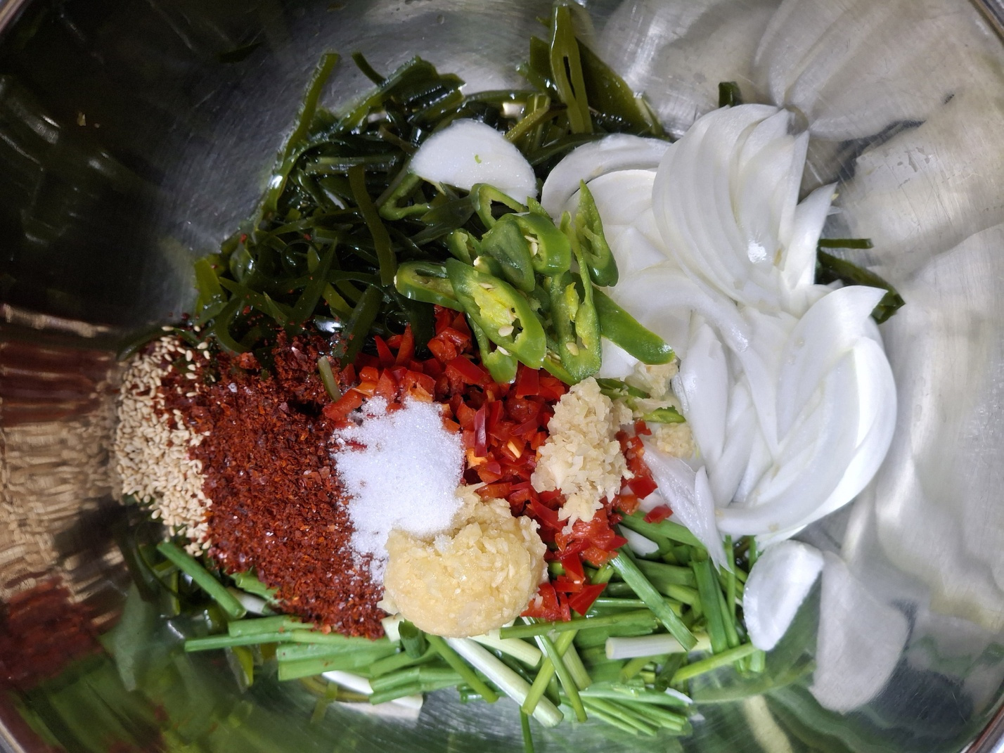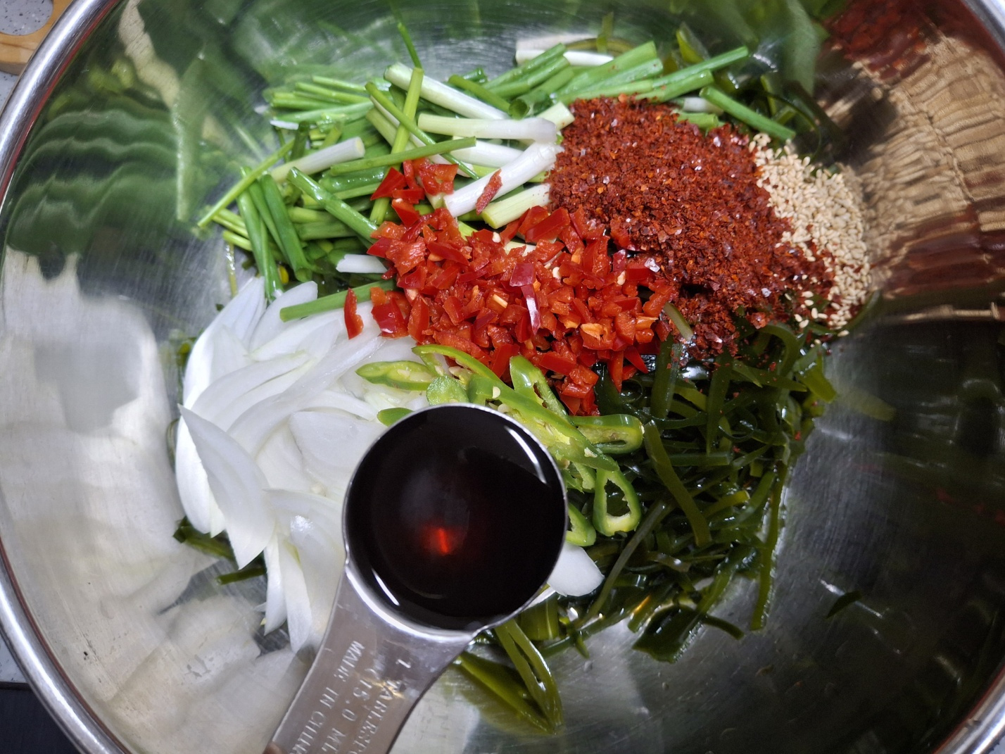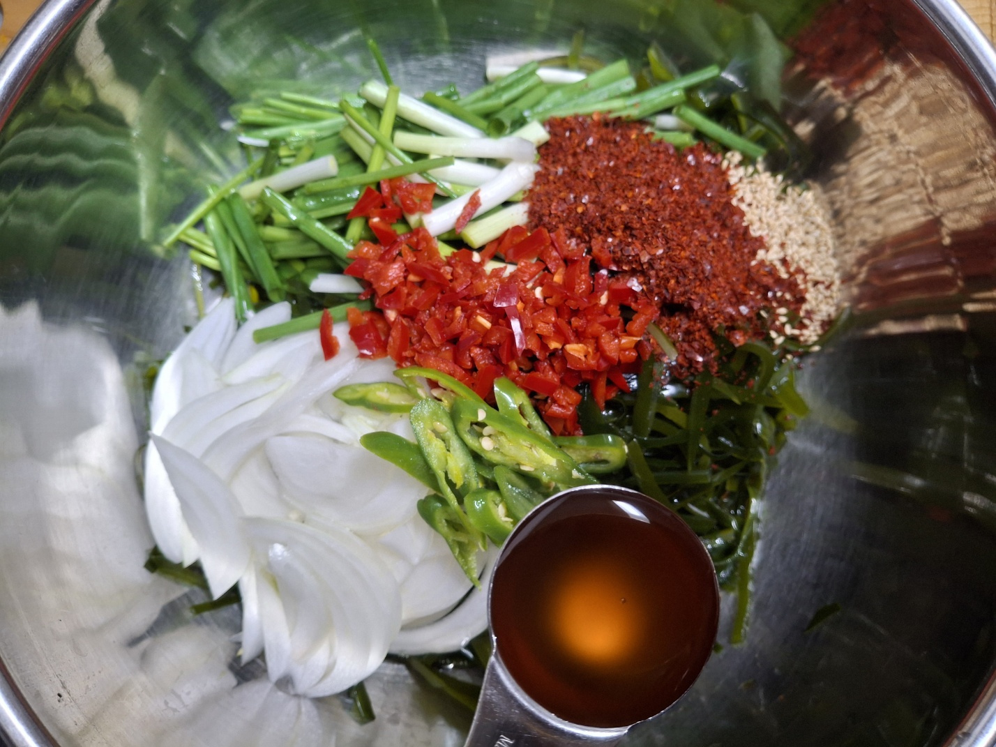 고춧가루 3큰술, 통깨 1큰술, 젓국 4큰술, 매실액 1큰술, 사과식초 3/2큰술