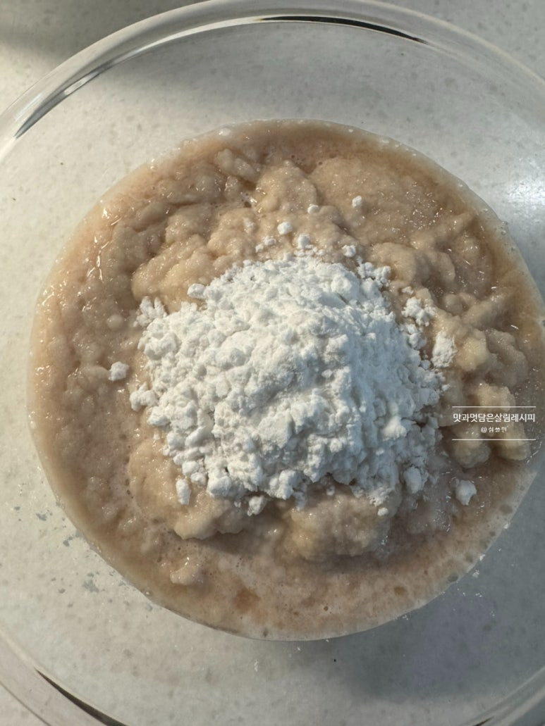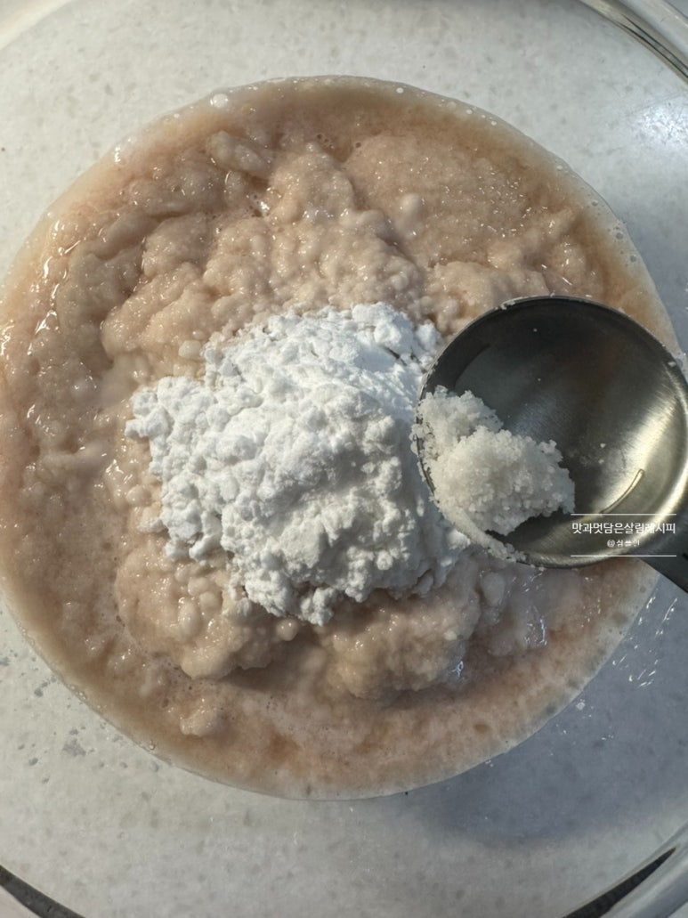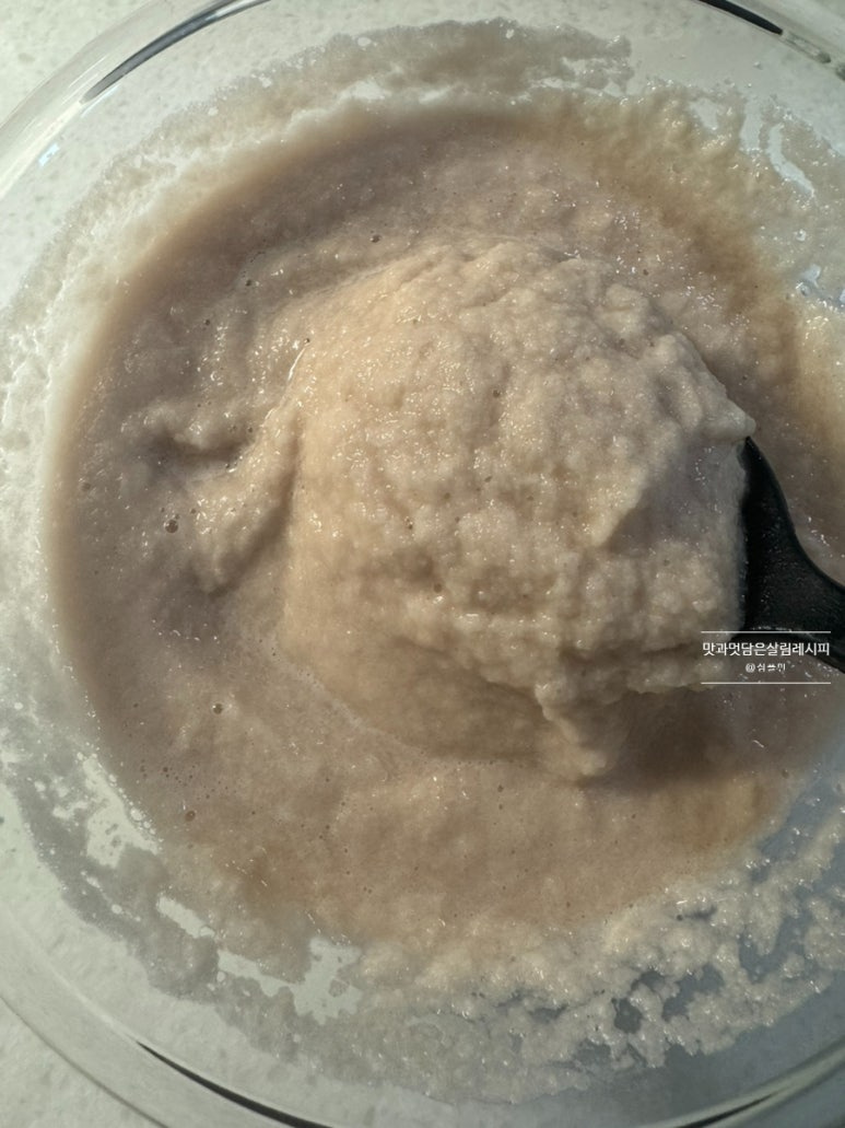 감자전분가루 3큰술 넉넉하게 담아 넣어줍니다. 따로 물을 걸러내지 않아도 농도를 맞춰주면서 쫀득하게 만들어 주는 역할을 합니다.
