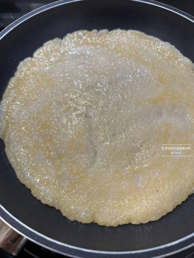 달군 팬에 식용유 넉넉하게 넣어주세요. 불은 약하지 않고 약간 센 불 상태로 유지하여 노릇하고 바삭하게 구워줍니다. 두껍지 않도록 고루 펼쳐 깔아줍니다.