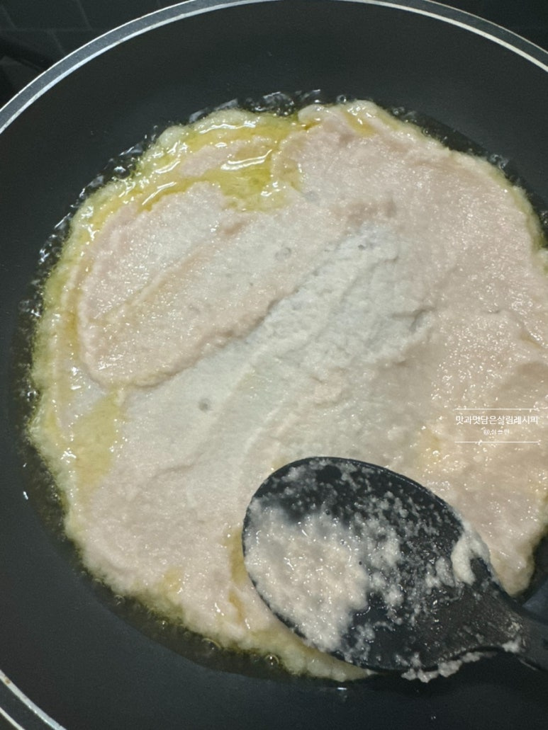 양파와 갈아줄 땐 간 뒤 채에 한번 걸러 수분을 제거한 뒤 반죽하는데요. 오늘은 감.자 자체로만 갈아 따로 걸러내는 과정 없이 전분가루 소량과 소금 간 적당히 하여 간단하게 반죽 끝내주었습니다.