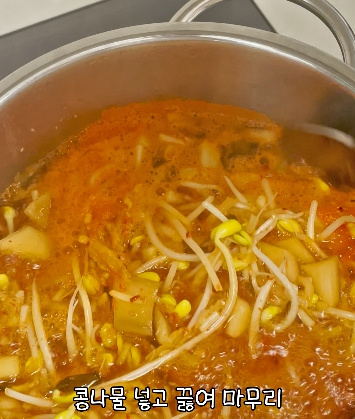 김치 국물이 충분히 우러났다면 콩나물을 넣고 뚜껑을 열거나 닫은 채로 일정하게 끓이기!