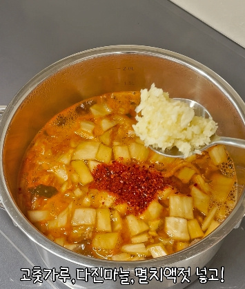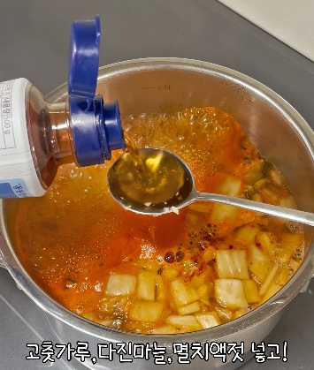 끓는 물에 김치를 넣고 고춧가루 1스푼, 다진마늘 1스푼, 액젓 2스푼을 넣어줍니다.