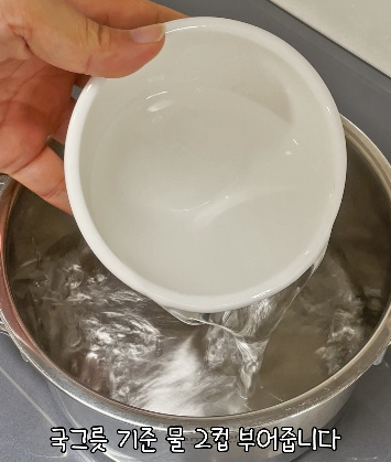 냄비에 물을 국그릇 기준 2번 붓고 끓입니다.