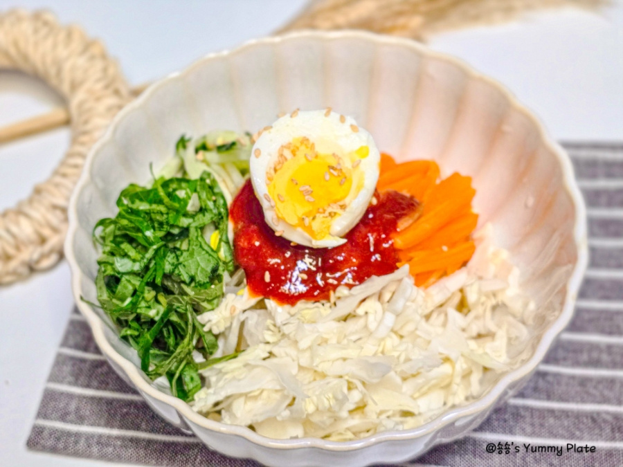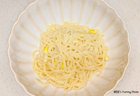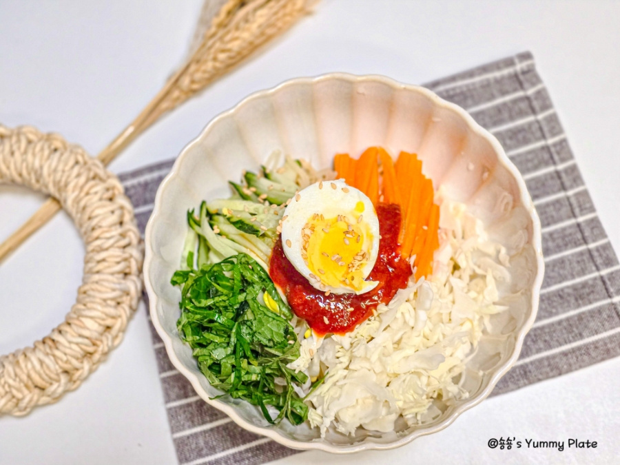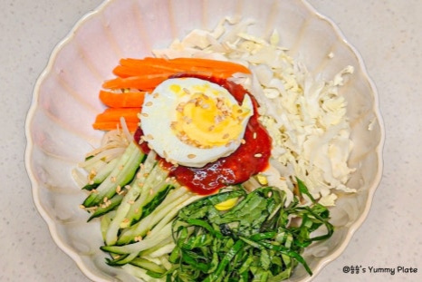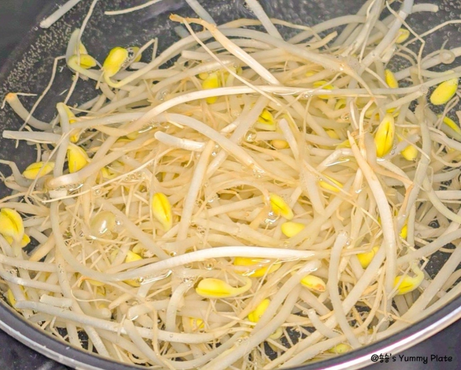콩나물을 중간에 넓게 깔아주면 비빌 때 양념이 골고루 섞여 비비기 훨씬 편하답니다.