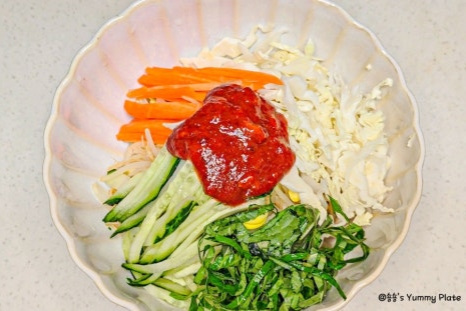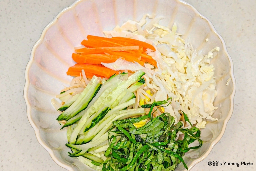 야채를 미리 썰어두면 숨이 죽어 아삭한 식감이 덜해지니 양념장 먼저 만들어 두는 게 좋아요.