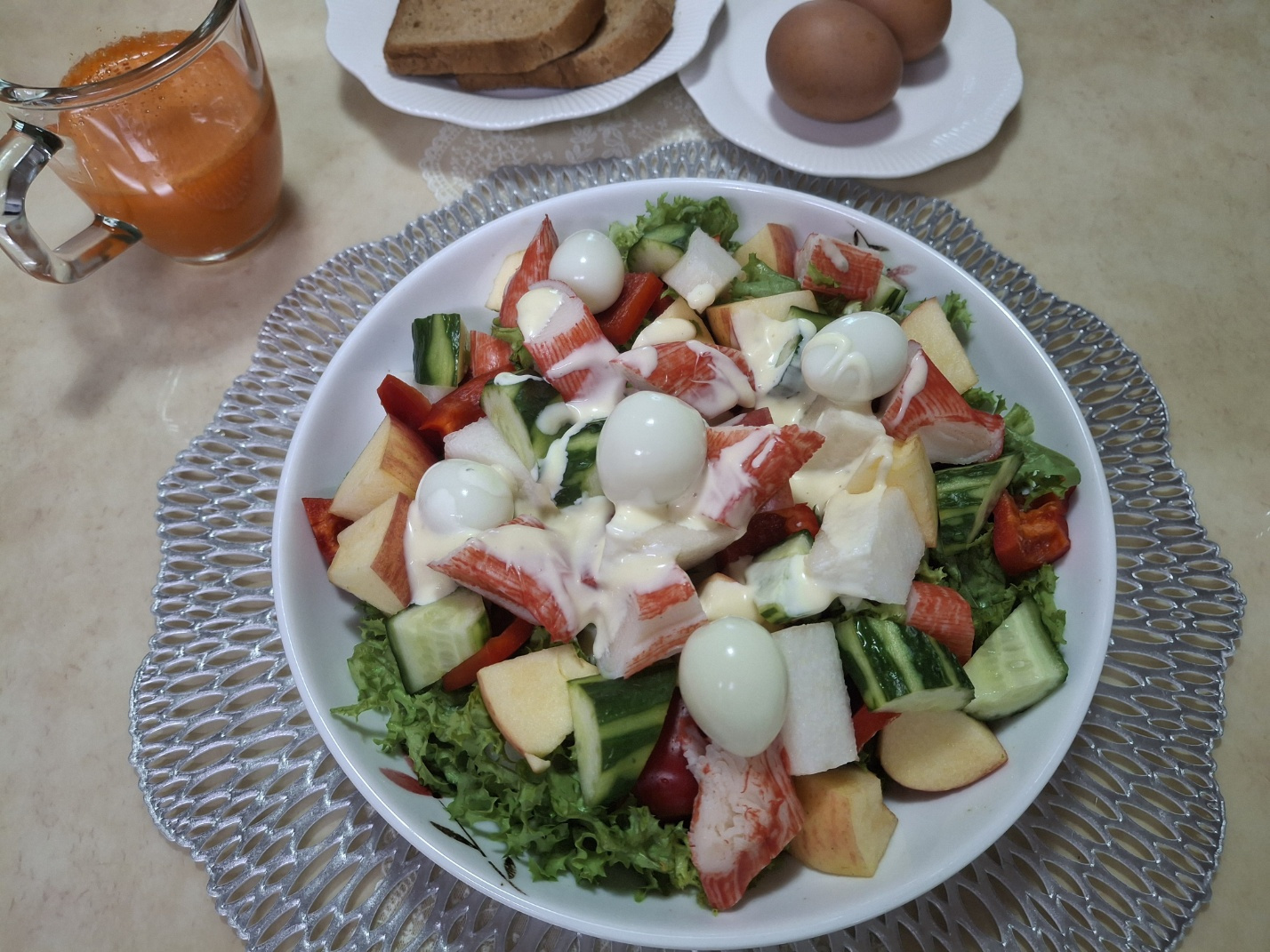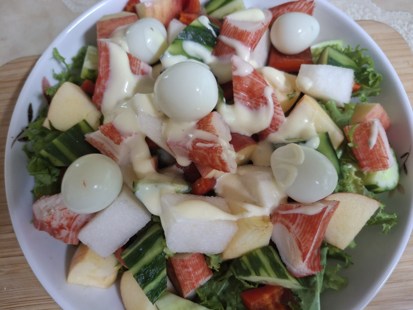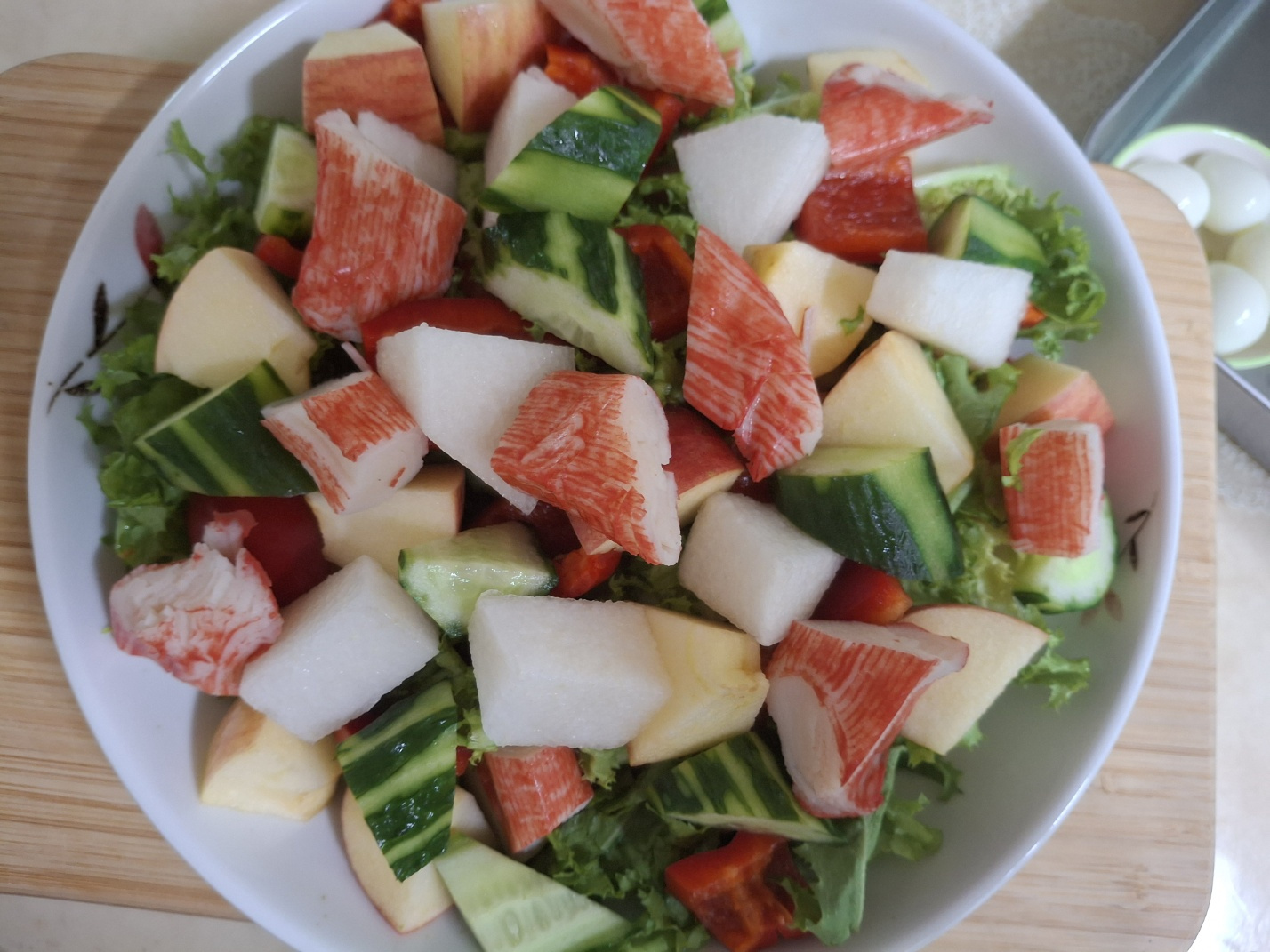 메추리알 5개, 맛살 4개, 배 1/2개, 사과(소) 1개, 파프리카 1개, 오이 1개, 치커리 1줌