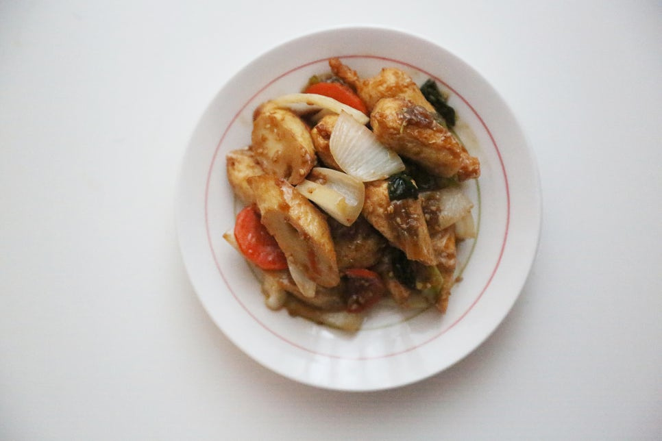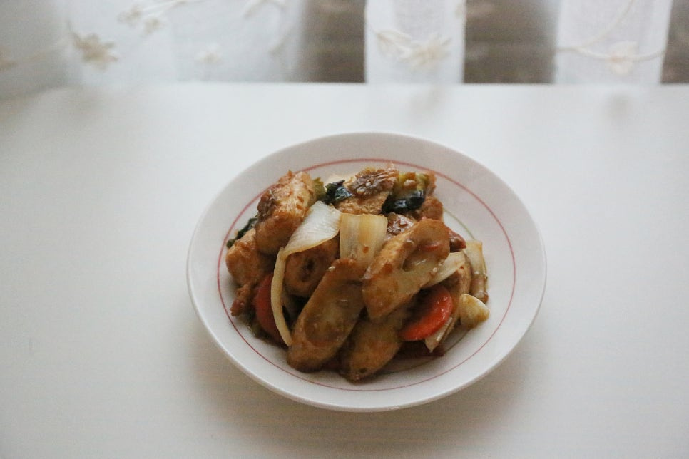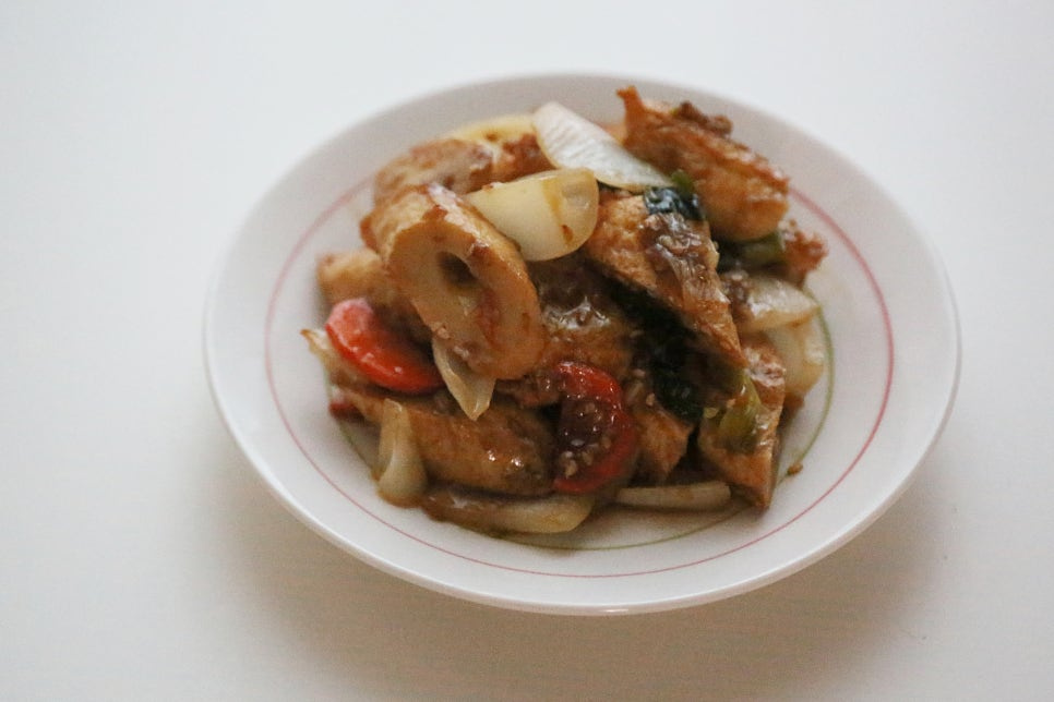 어묵 10개, 양파 1/2개, 굴소스 1스푼, 진간장 2스푼, 올리고당 0.5스푼, 맛술 2스푼