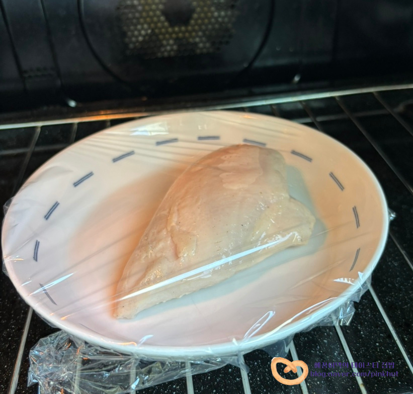 닭가슴살은 전자레인지에 1분 30초간 데워주었어요. 데우기만 해도 되지만 저는 프라이팬에 노릇하게 구워봤어요