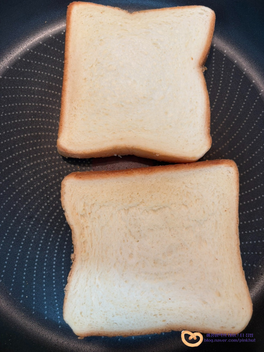 중약불로 예열한 팬에 식빵을 올려 앞뒤로 노릇노릇 구워주세요. 고소함을 더해줄 버터를 넣어 구워주셔도 좋아요