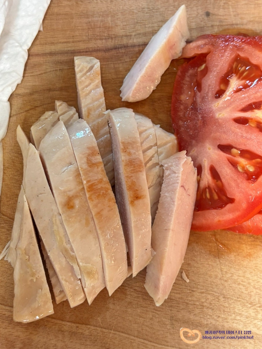 류수영님처럼 닭가슴살 구워 만들면 더 맛있겠지만 저는 집에 훈제 닭가슴살이 있어서 간단하게 시판 닭가슴살을 사용해 봤어요. 햄, 치즈, 토마토, 계란, 상추 정도만 있어도 맛보장이니 닭가슴살 없는 분들은 생략하셔도 좋고요, 냉장고에 있는 재료들을 활용해서 맛있게 즐겨 보세요.