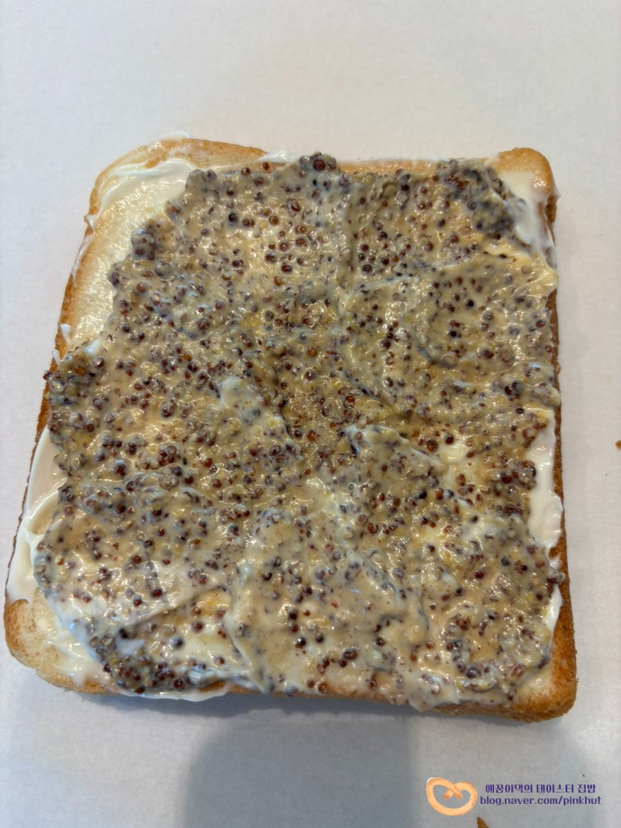 마요네즈 위에 홀그레인 머스터드를 펼쳐 발라줍니다. 류수영 님은 1T 듬뿍 사용하셨는데 호불호가 있는 재료인 만큼 너무 많이 바르는 것보다는 적당히 발라주시는 걸 추천해요.