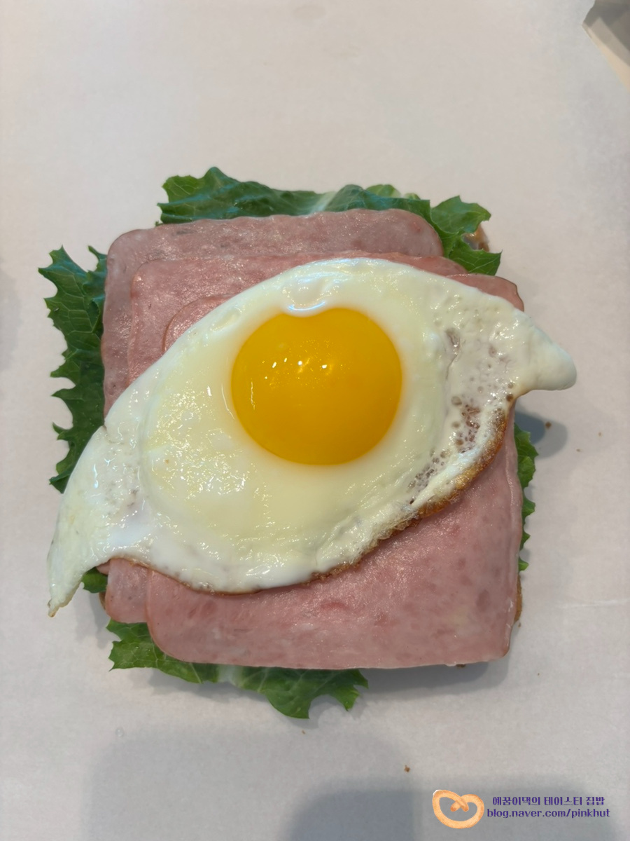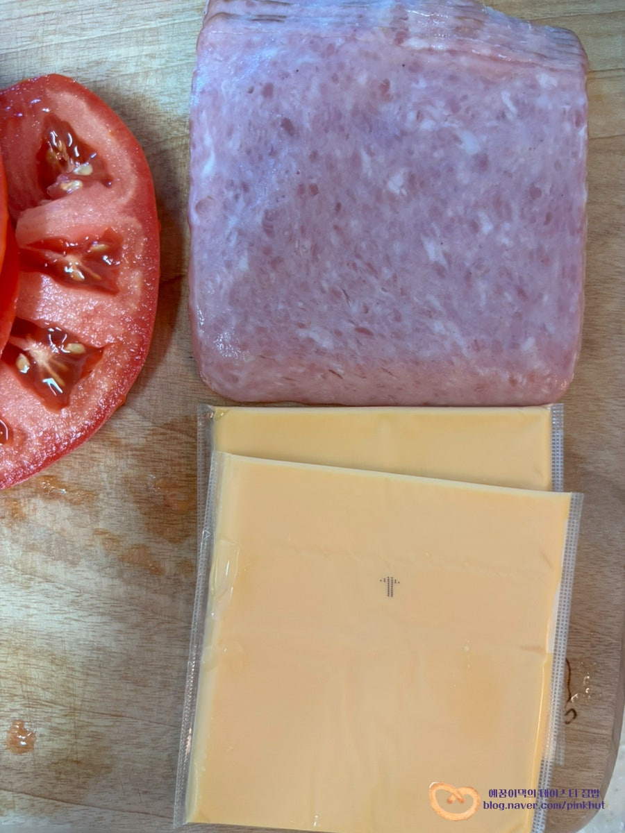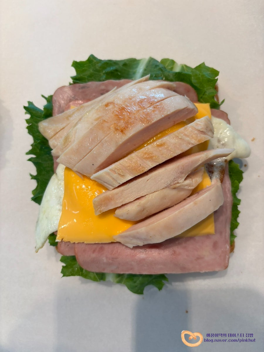 그 위에 샌드위치용 햄 3장을 올려주세요. 햄이 얇기 때문에 너무 적게 넣으면 맛이 덜 느껴질 수 있어요. 넉넉히 올려줄수록 더 맛있어요
