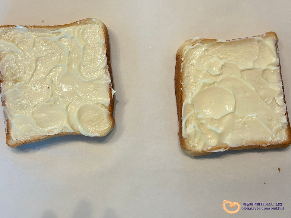 종이호일을 깔고 그 위에 구운 식빵을 올려주세요. 마요네즈를 2T 골고루 펴 발라주세요.