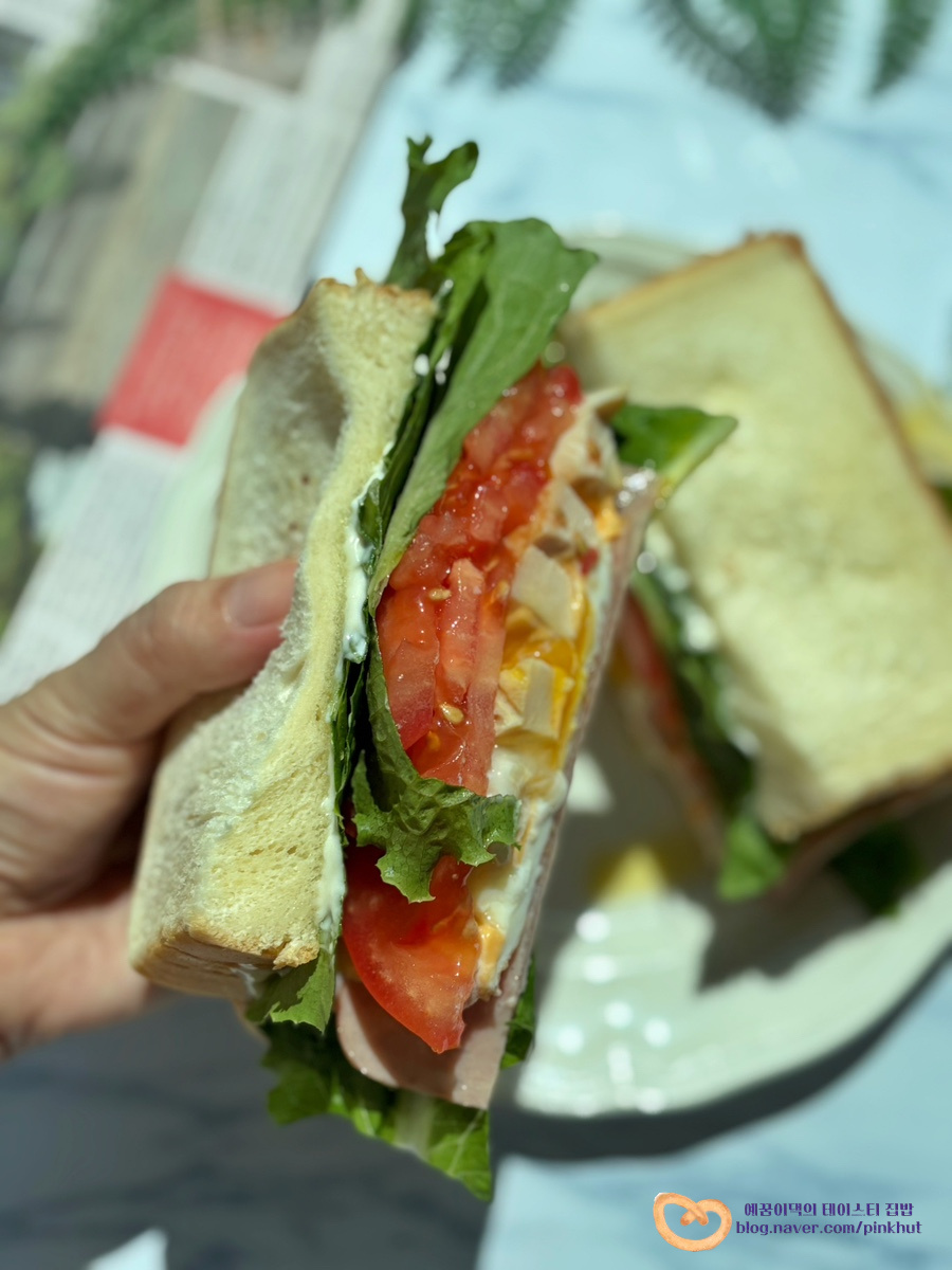 보통 클럽샌드위치에 들어가는 재료는 상추, 토마토, 슬라이스햄, 치즈, 계란후라이 등을 다양하게 넣을 수 있어요. 여기에 류수영님은 닭가슴살도 직접 구워서 사용하셨는데요 재료가 푸짐하게 들어가니 뚱뚱 샌드위치 완성입니다.