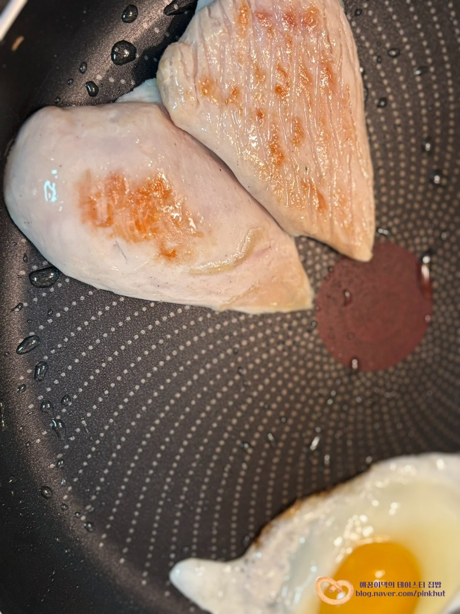 닭가슴살 앞뒤로 노릇노릇하게 굽고요, 달걀프라이는 반숙, 완숙 선호하시는 걸로 만들어 주면 되세요.