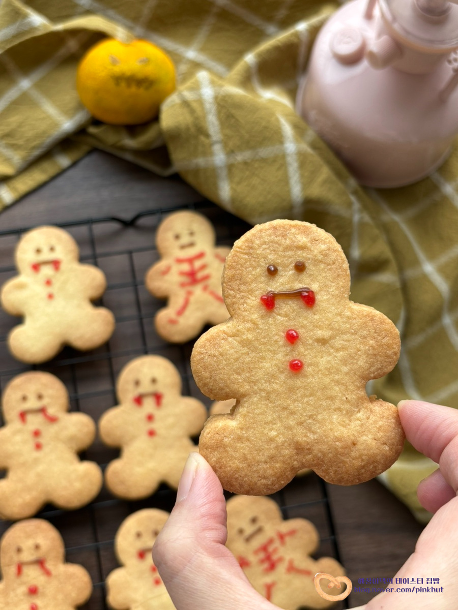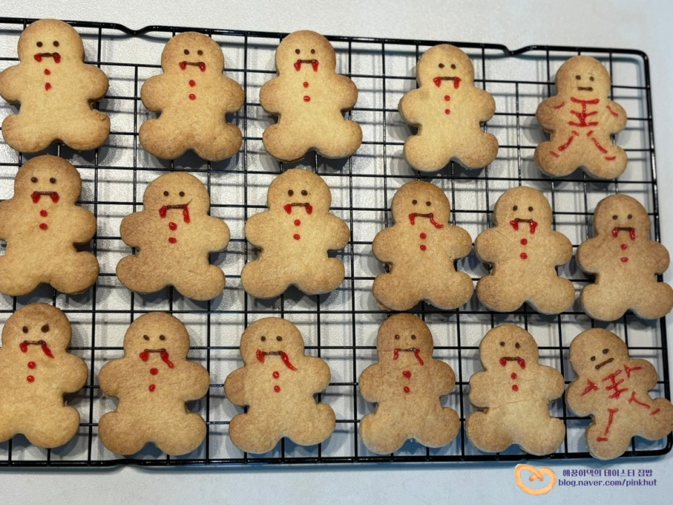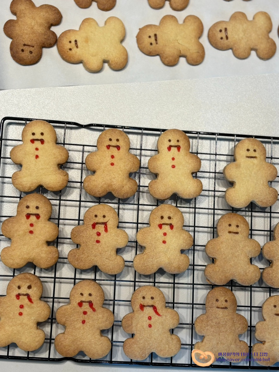 검정색, 빨강색 등 데코펜을 활용하면 너무나 쉽게 할로윈 버터쿠키 만들기 하실 수 있어요. 진저브레드가 피를 뚝뚝 흘리는 모습에 잠시 움찔하게 되지만 한입 베어 물면 고소하고 너무 맛있는 박력분, 아몬드가루 조합의 쿠키 맛에 사로잡히게 돼요.
