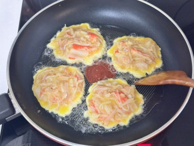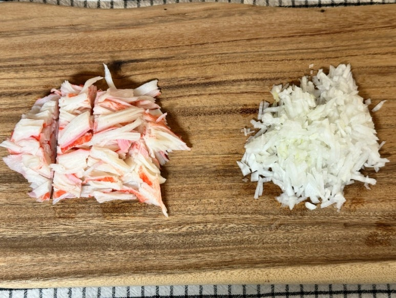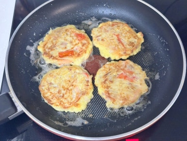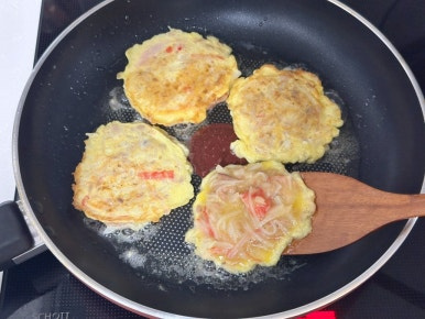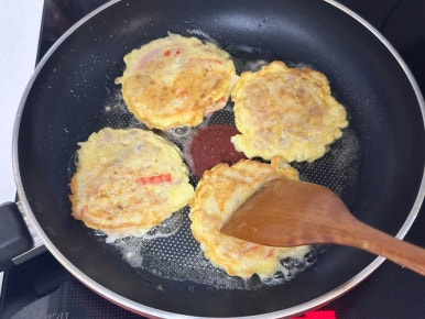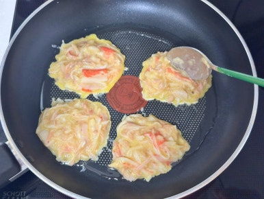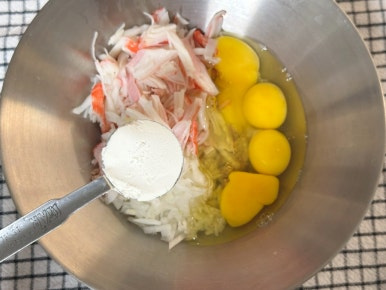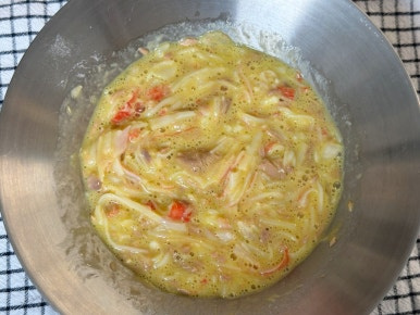 참치캔 1캔 , 크래미 5개 , 달걀 5개 , 양파 1/4개 , 부침가루 1T , 천일염 0.5t , 식용유 넉넉히