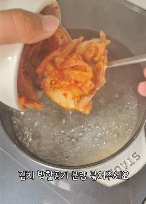김치는 밥공기 기준 한 그릇 정도만 준비해서 넣어주는데요, 김치는 겉절이 보다 푹 익은 김치일수록 더 깊은 맛이 납니다.